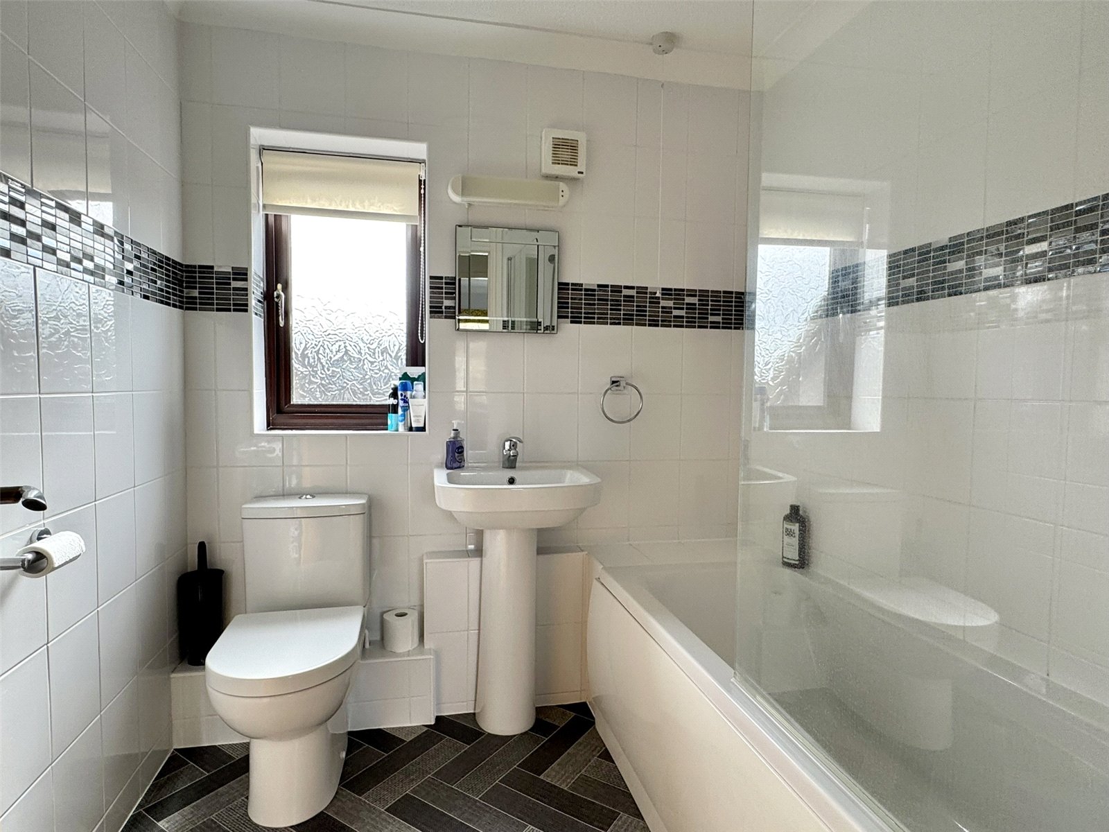 Bathroom Fitted with a three-piece suite comprising panelled bath with shower attachment and screen, pedestal wash hand basin and low level W.C. Heated towel rail, light, shaving point, extractor and opaque double glazed window to the front aspect.