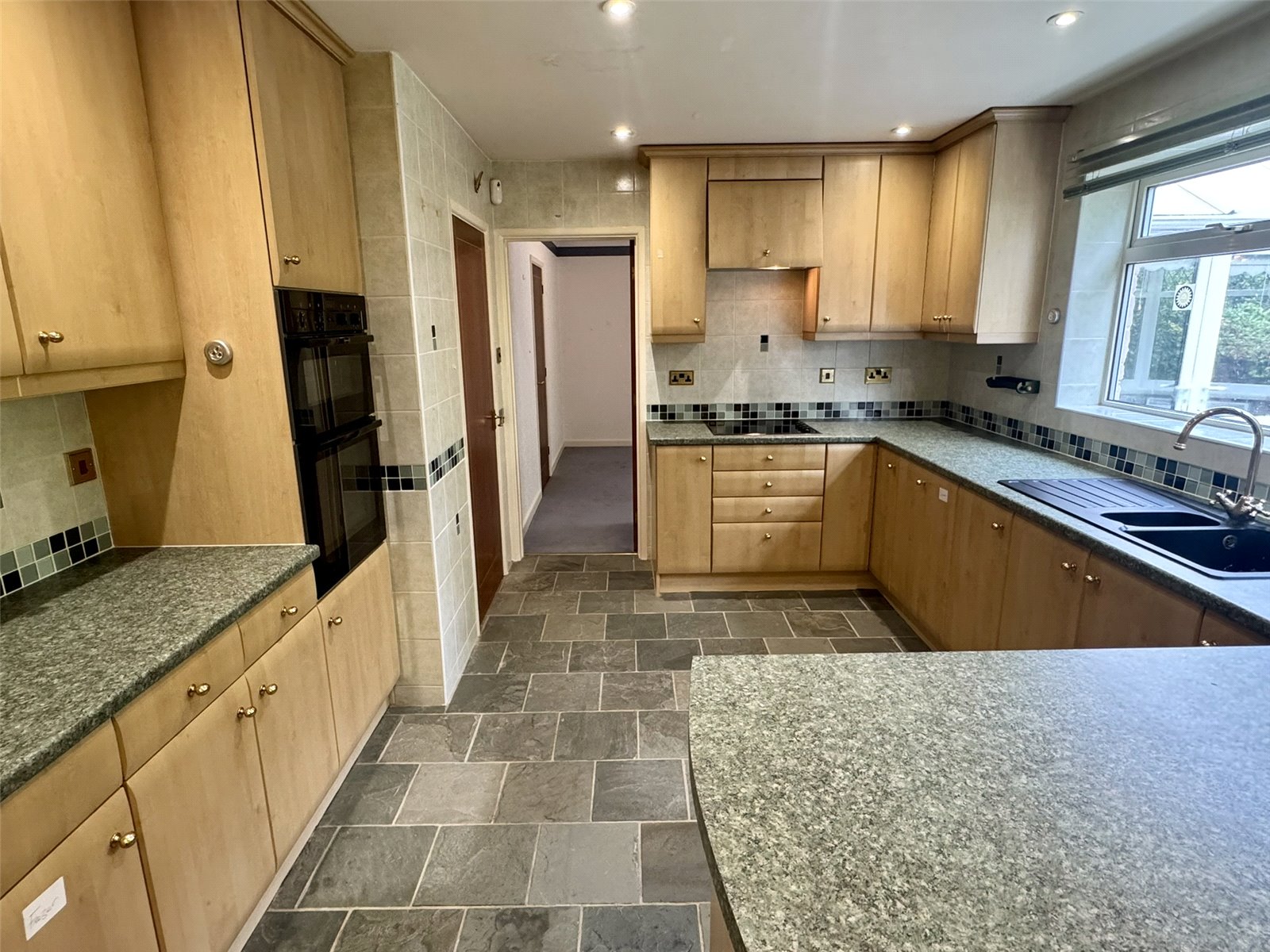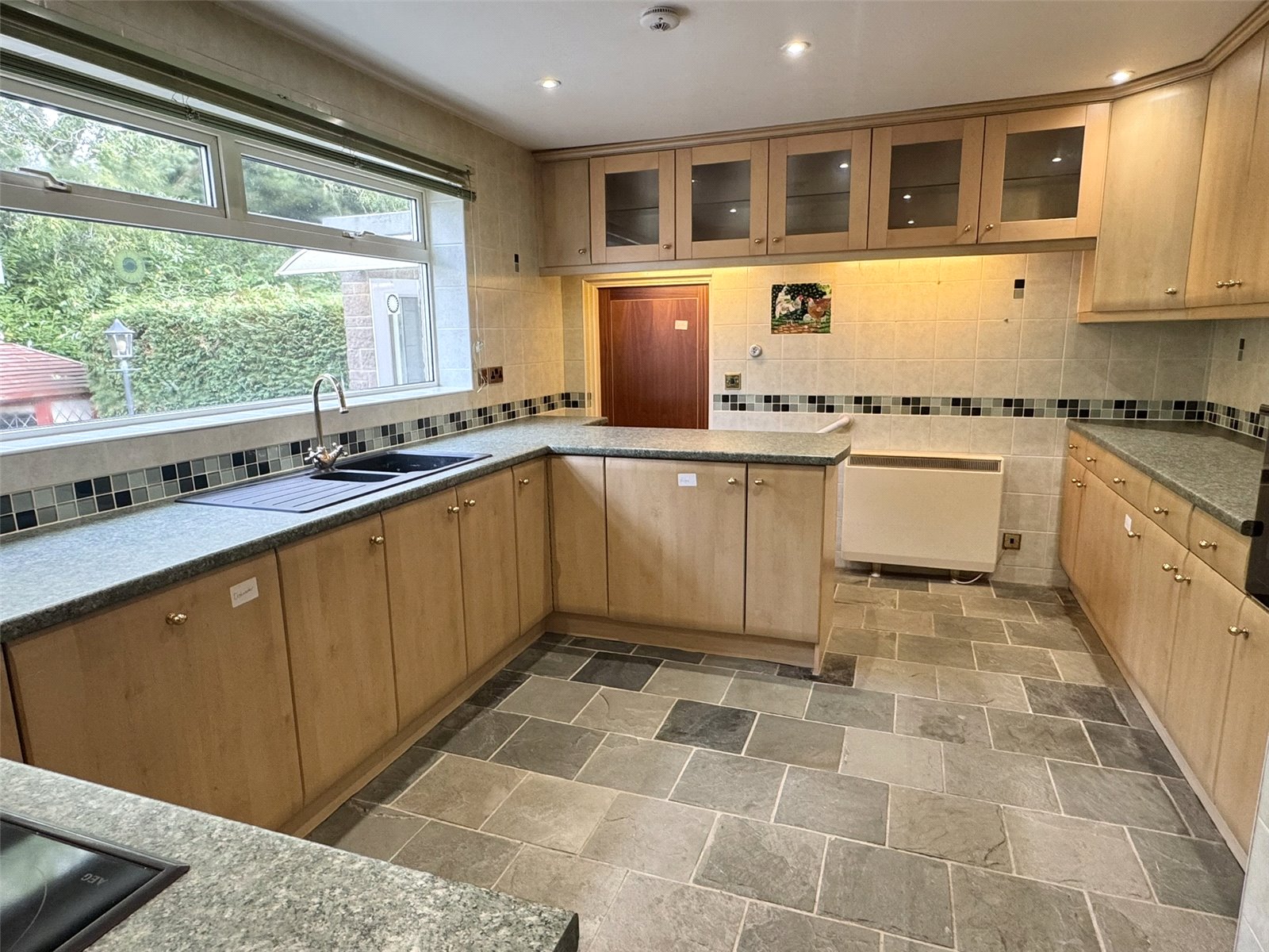 Kitchen 14'10" (4.52m) x 8'10" (2.69m) widening to 11'3" (3.43m). Fitted with a vast selection of wall, base and display units set beneath worktops with inset one and a half bowl sink and drainer. Integrated appliances including base fridge, base freezer, dishwasher, elevated oven and inset electric hob with hood over. Spotlights, television point, electric night storage heater and double glazed window to the rear aspect. Steps and door out to utility room.