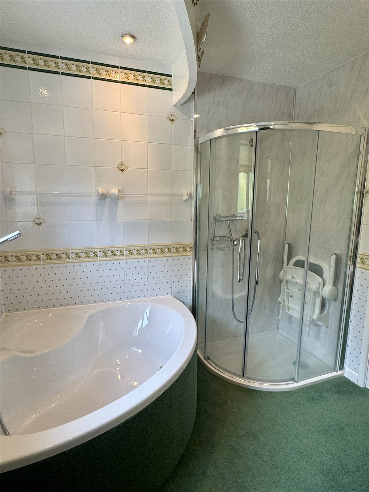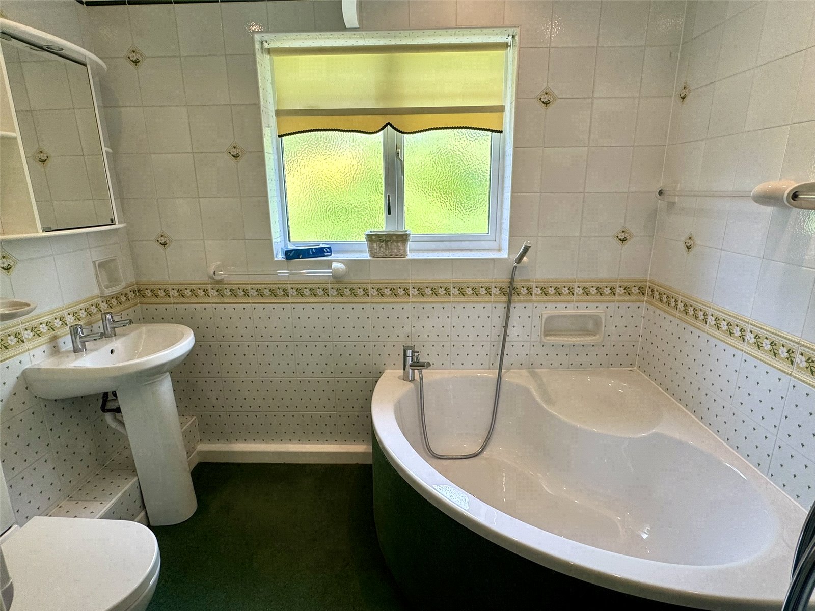 Bathroom Fitted with a four-piece suite comprising corner shower cubicle with mains shower, corner bath with shower attachment, low-level W.C and pedestal wash hand basin. Tiled splashbacks. Wall mounted electric fan heater and opaque double glazed window to the rear aspect.
