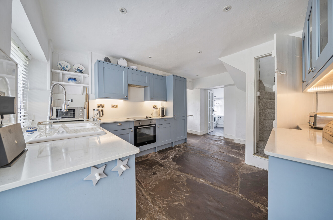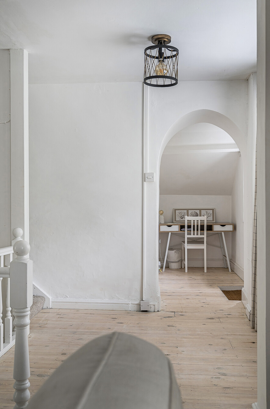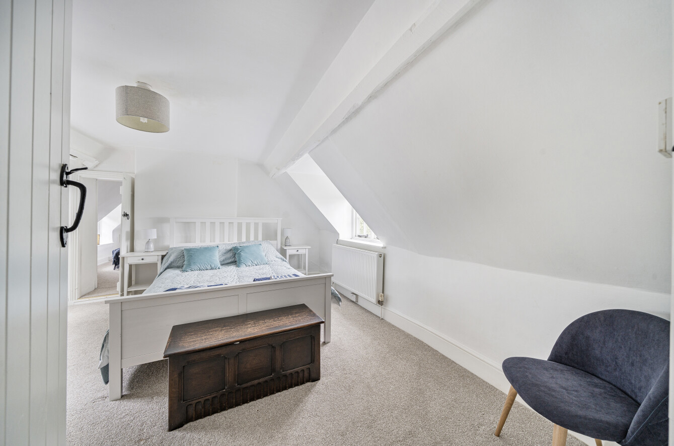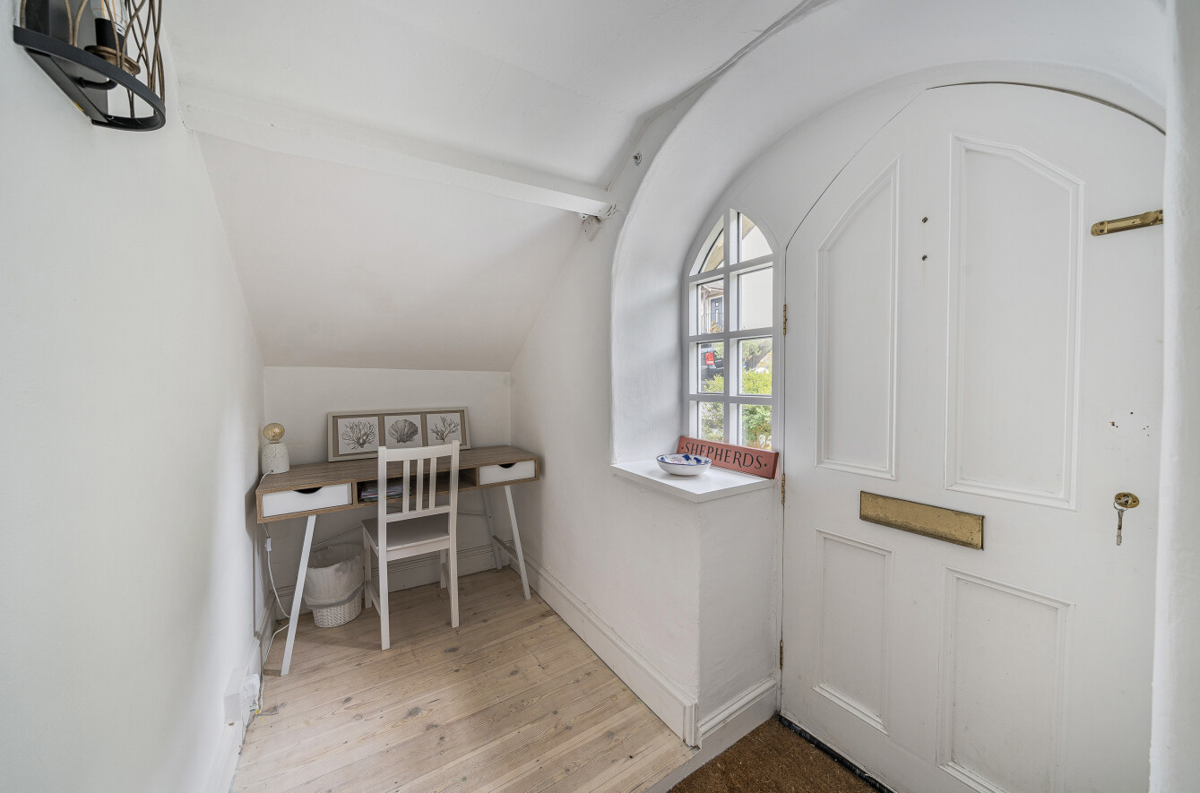 Continuing on the ground floor, the property opens into a tastefully presented living room with an inset wood-burning stove, which flows through to the versatile garden room. This provides additional living space with doors opening out to the garden. Also on this level is a family bathroom and a third bedroom, which could equally serve as a home office if required.
