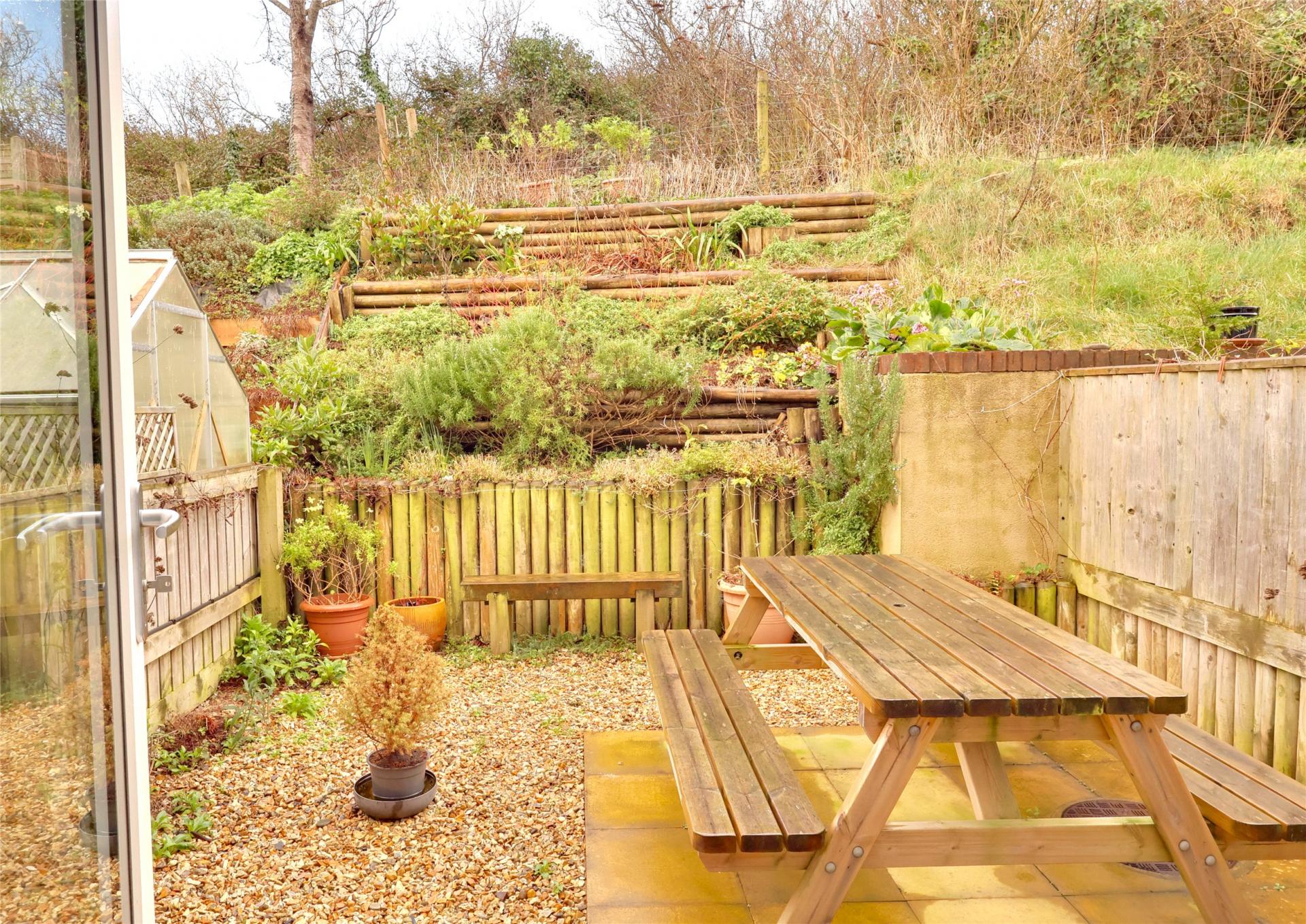 Outside there is an enclosed south facing level garden located at first floor level off the kitchen and is paved and gravelled with terraced flower and shrub beds beyond.