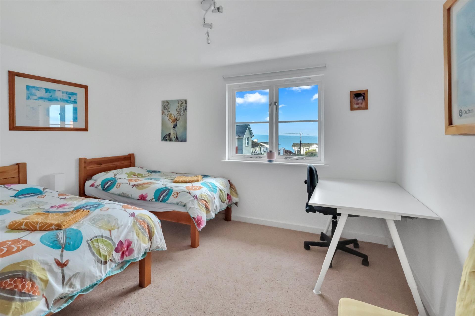 A carpeted staircase from the landing leads to the top floor where the principal bedroom suite enjoys wonderful coastal views and the comfort of an en-suite shower room fitted with a three piece white and chrome suite.