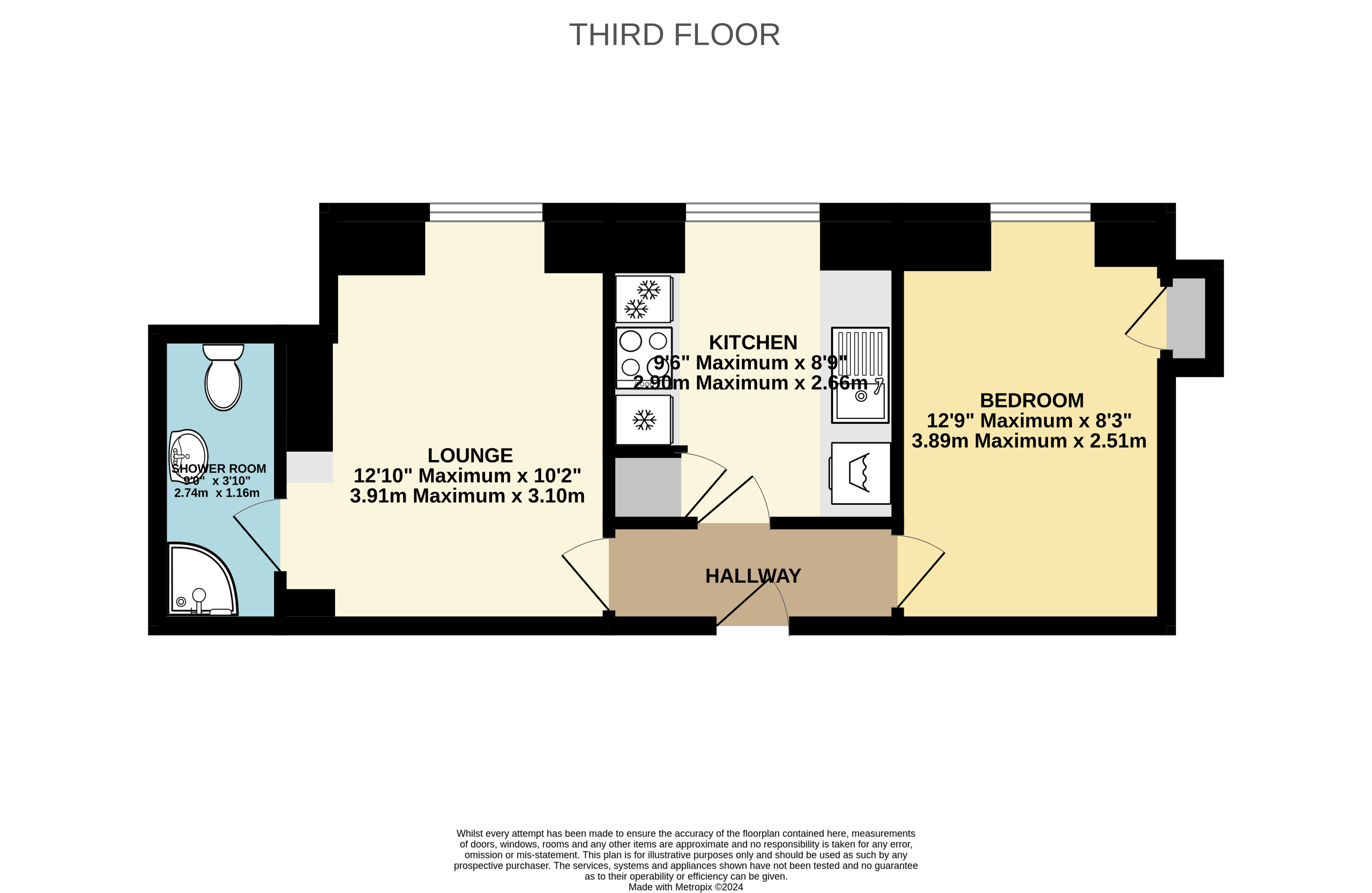 Shower Room 9' x 3'10" (2.74m x 1.17m).