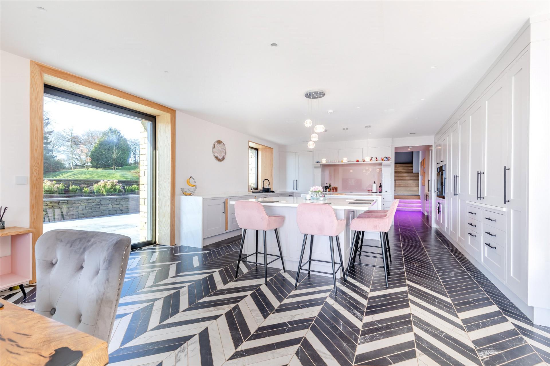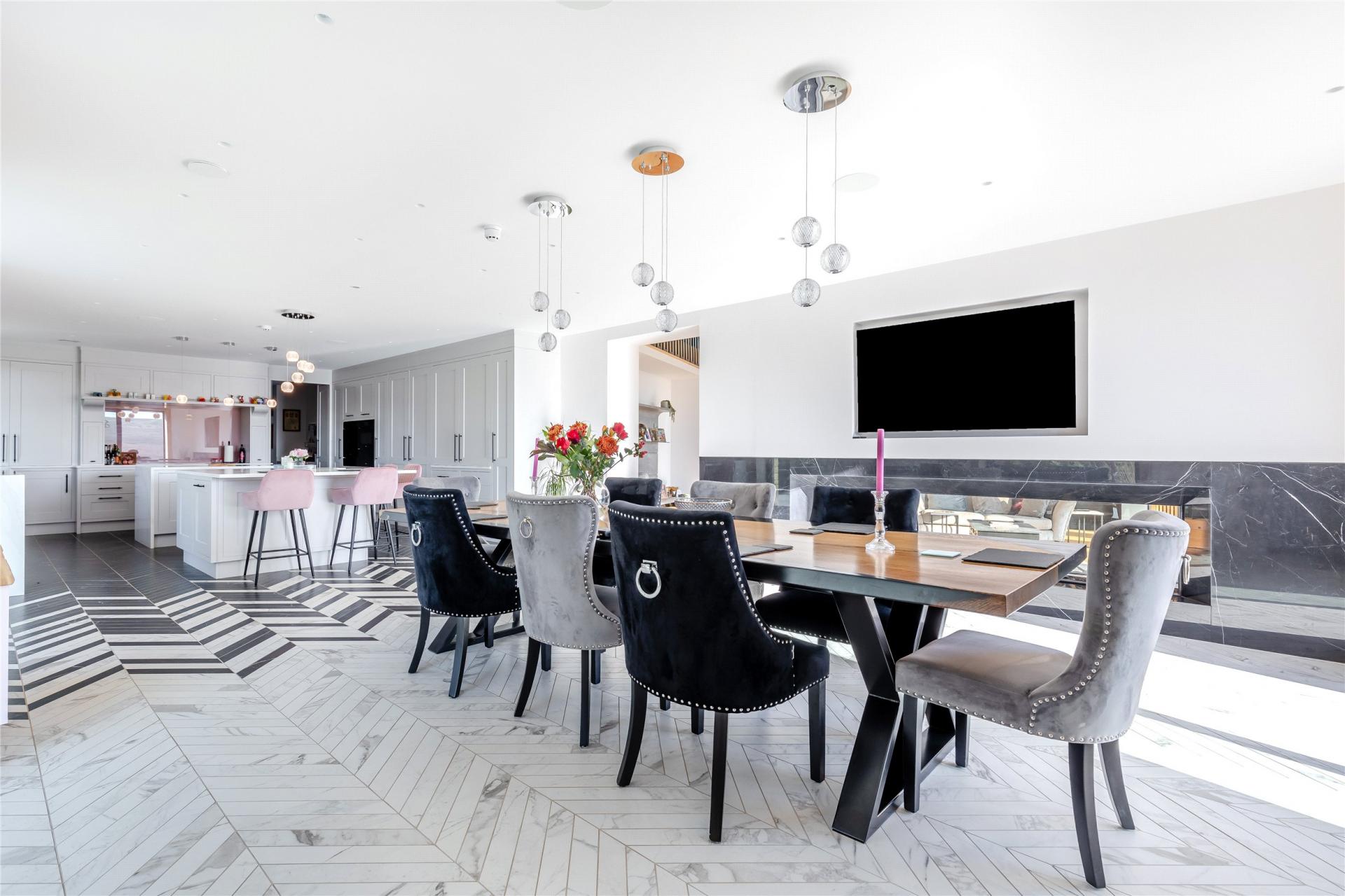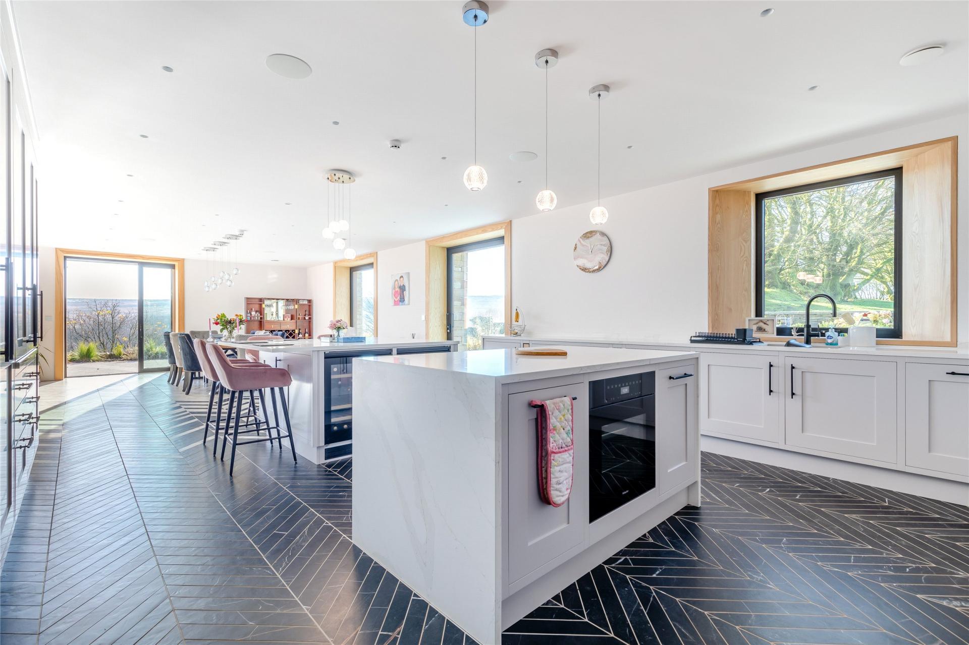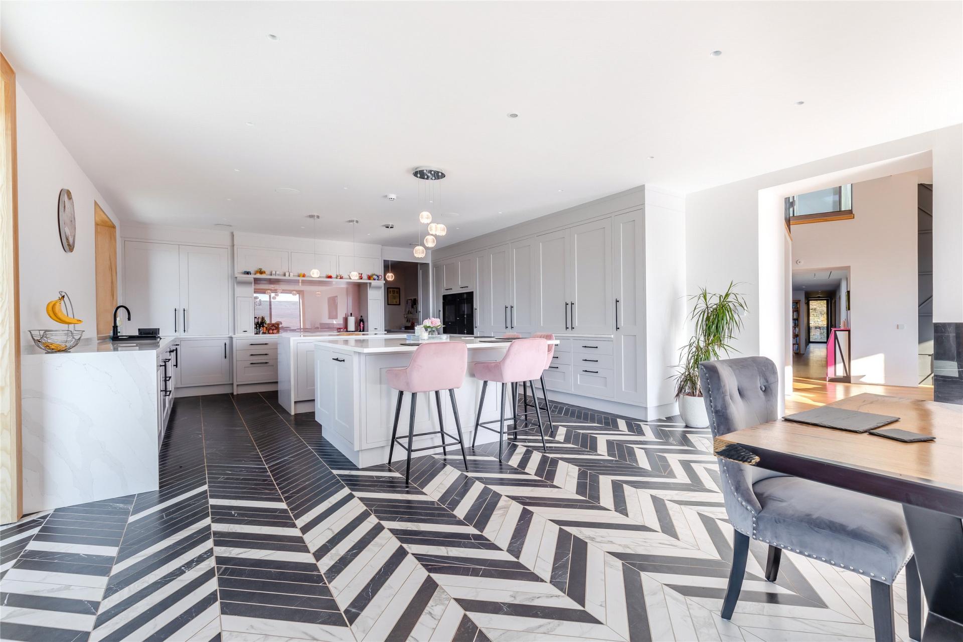 Steps lead to the substantial and impressive open-plan, double-aspect kitchen/diner, a true centre piece of the home. Featuring individually laid herringbone flooring and a bespoke fitted kitchen, it offers an extensive range of custom wall and base units designed for both style and functionality. The kitchen includes two sinksone with instant hot waterintegral appliances, and two islands, providing ample workspace and facilitating effortless entertaining. Thoughtfully designed to maximize space, this area seamlessly blends practicality with aesthetic appeal, creating a harmonious indoor/outdoor vibe that connects the living space with its stunning surroundings.