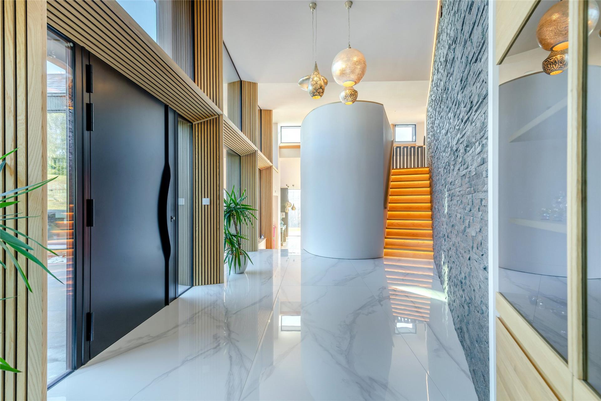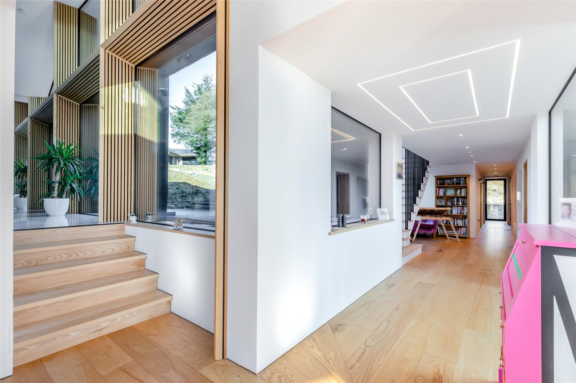 Automatic lighting illuminates the stairs, leading down to the attached garage and the plant room housing the propertys advanced communications systems. The garage is fitted with an automatic door, providing seamless access to the parking and turning area. This integration of convenience and technology ensures practicality while maintaining the homes modern and bespoke design.