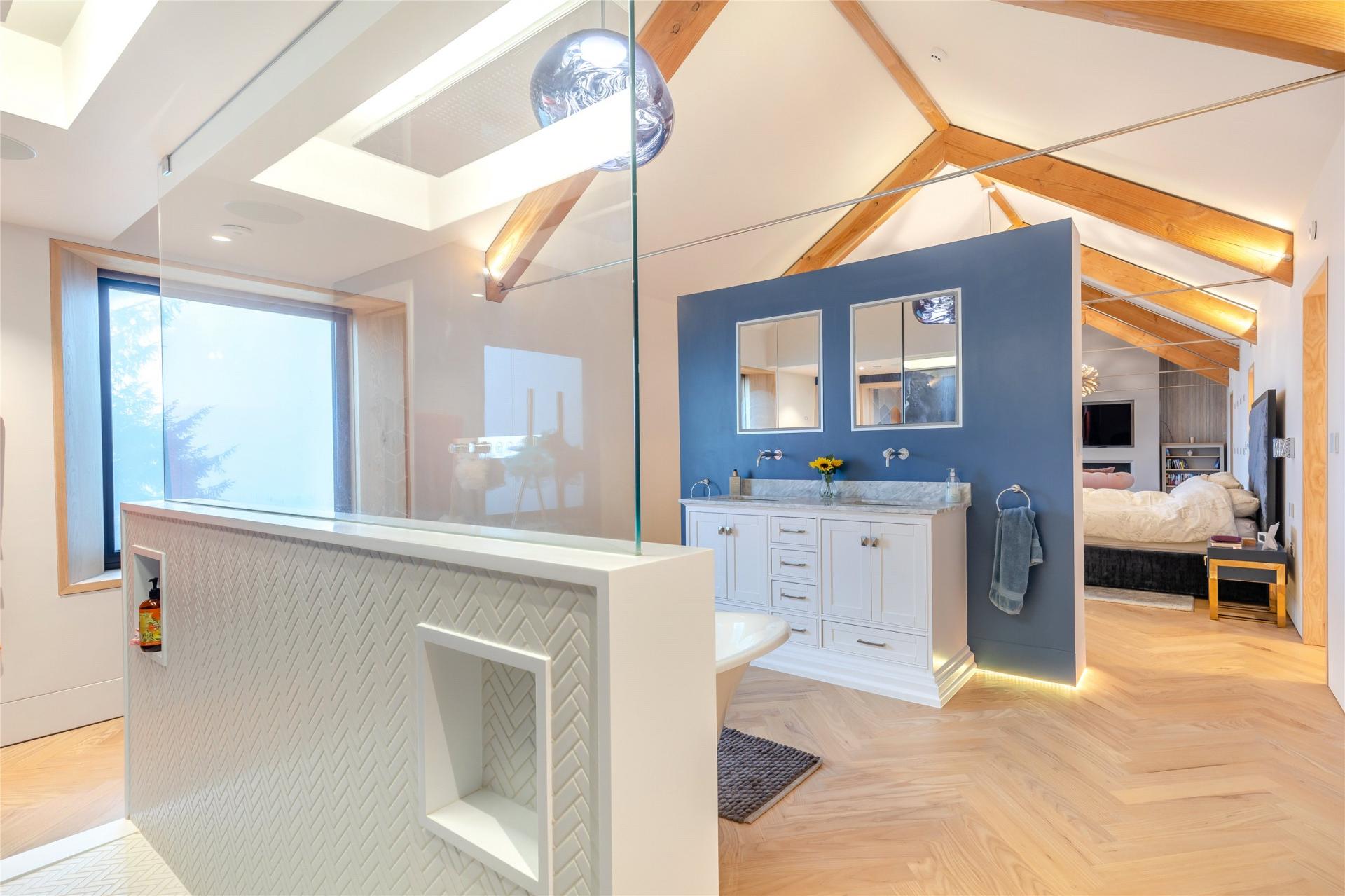 From here, stairs lead a landing area where youll find the exceptional master bedroom. This spacious retreat features a dedicated living area with large screen and individual feature fireplace creating a serene and comfortable atmosphere. The master suite also boasts a partitioned en-suite with a large walk-in shower, twin sinks, a separate W.C., and a luxurious bath, ensuring both functionality and indulgence.