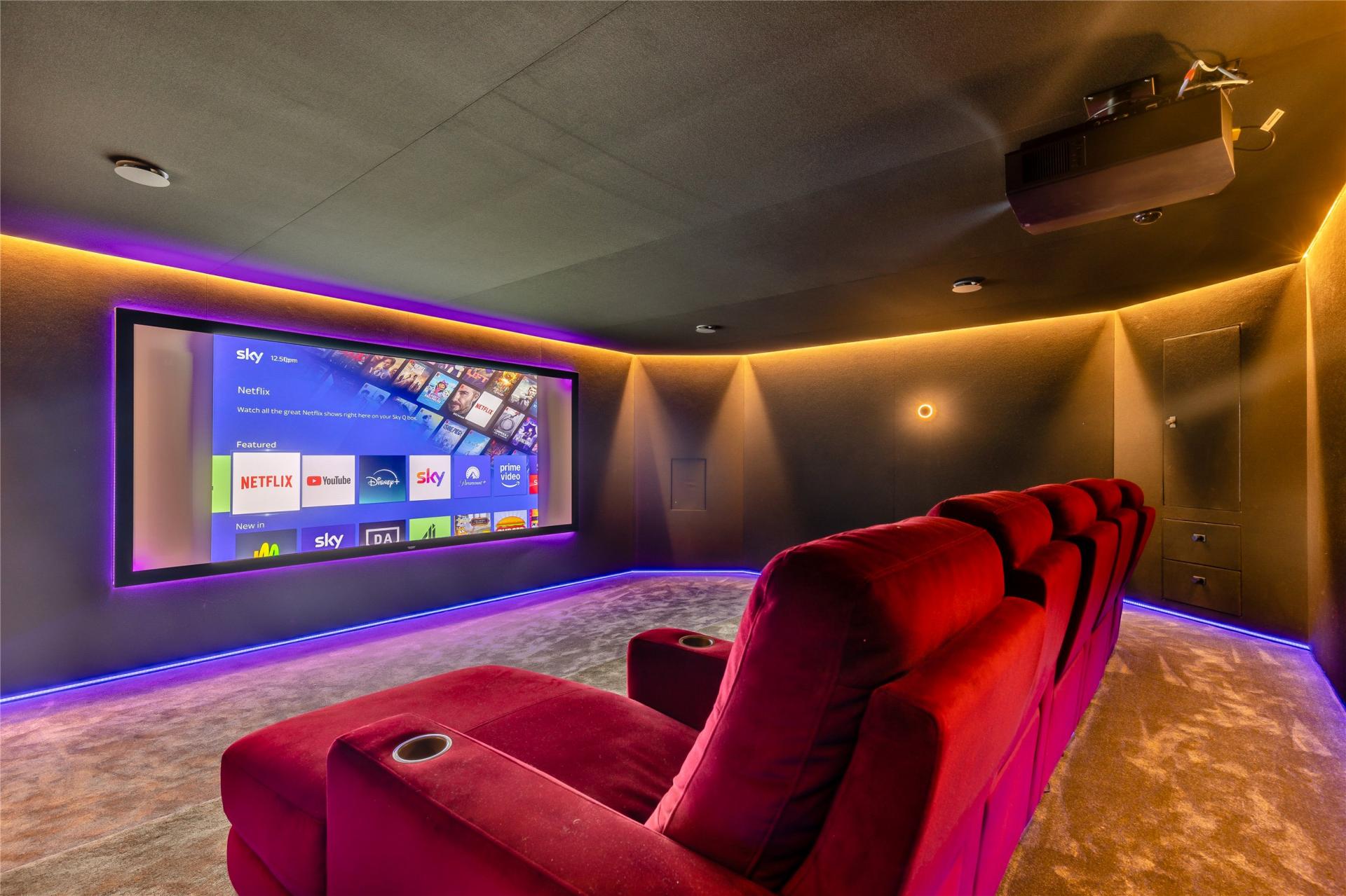 This hallway also provides access to the family home cinema room, a standout feature of the home. Equipped with built-in speakers, a huge screen, and five luxurious reclining chairs, this room is tailored for the ultimate entertainment experience. With dedicated storage for drinks and popcorn, its the perfect spot for enjoying movie nights in true comfort and stylea truly remarkable addition to this exceptional property.