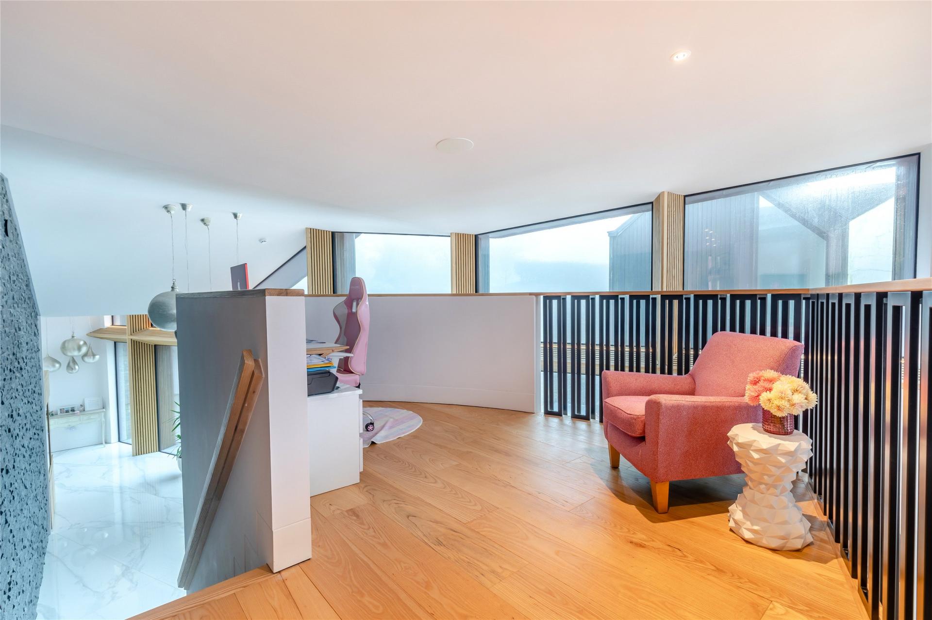 From the balcony, there is access to two double bedrooms, each benefiting from its own en-suite bathroom. These en-suites are beautifully appointed with walk-in showers and separate baths, combining luxury with functionality. Additionally, Bedroom 2 includes a discreet games room/home office, offering a flexible space that can be tailored to suit various needs, whether for work or leisure. This thoughtful design ensures both privacy and comfort for the occupants.