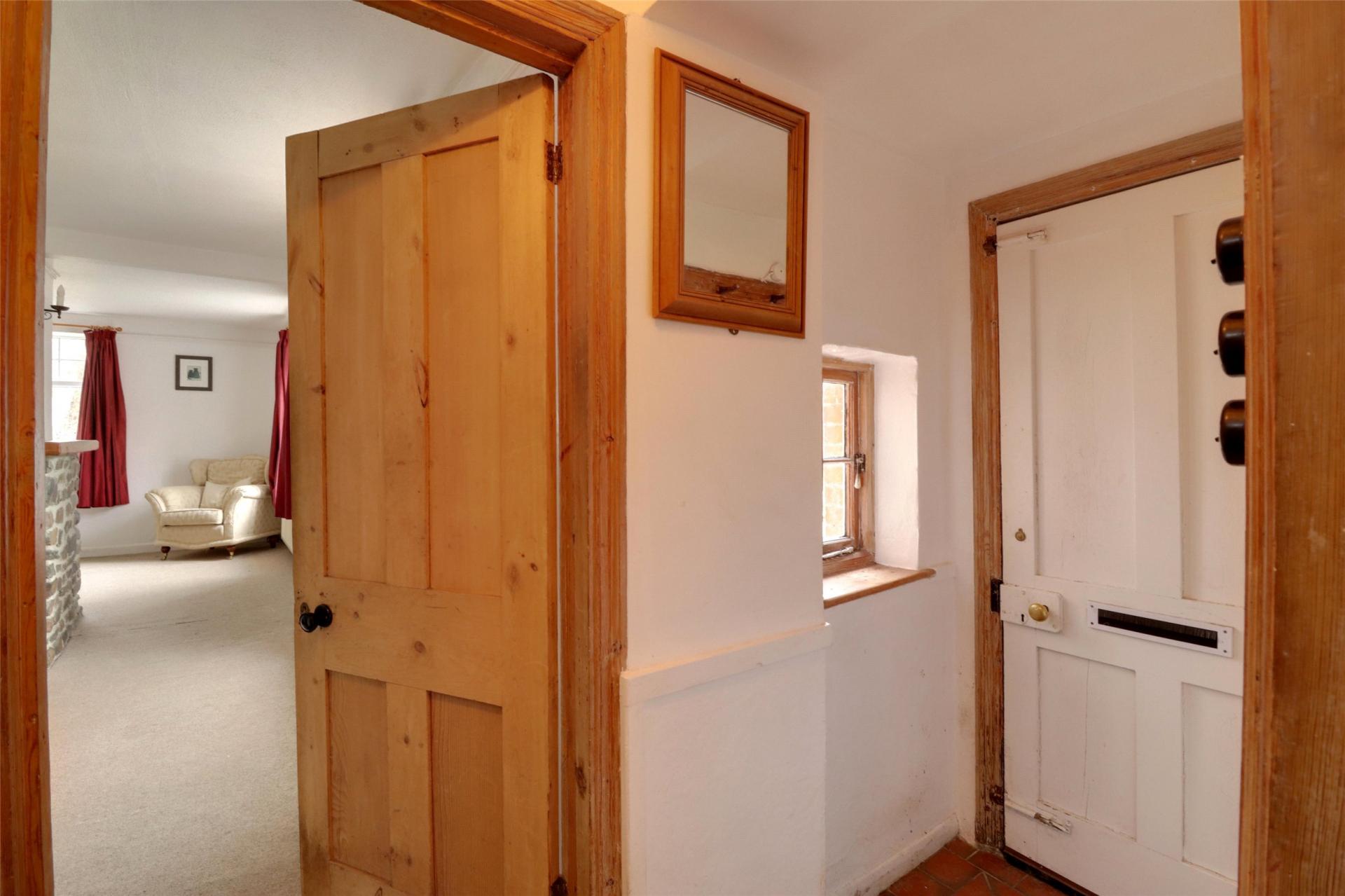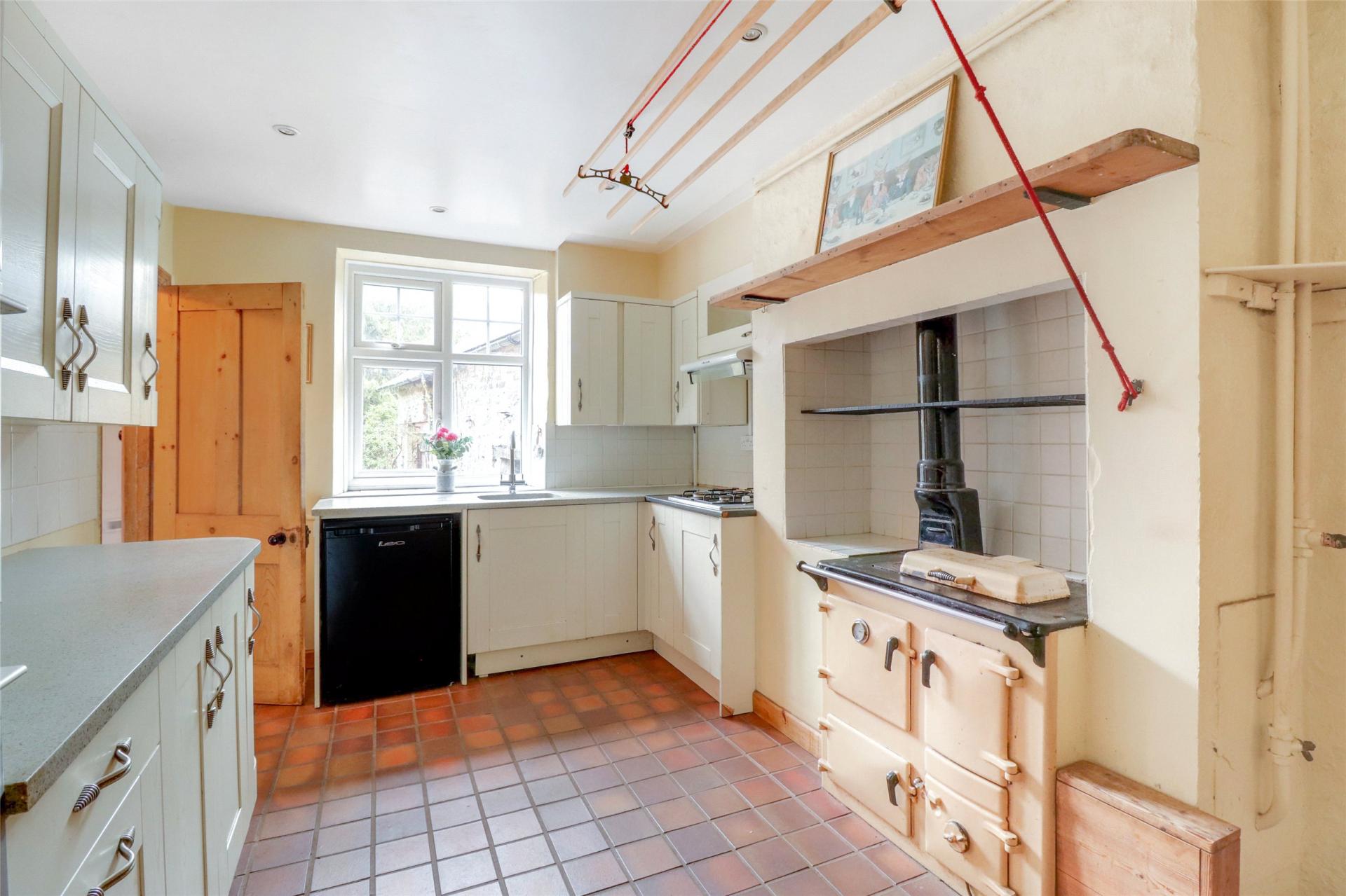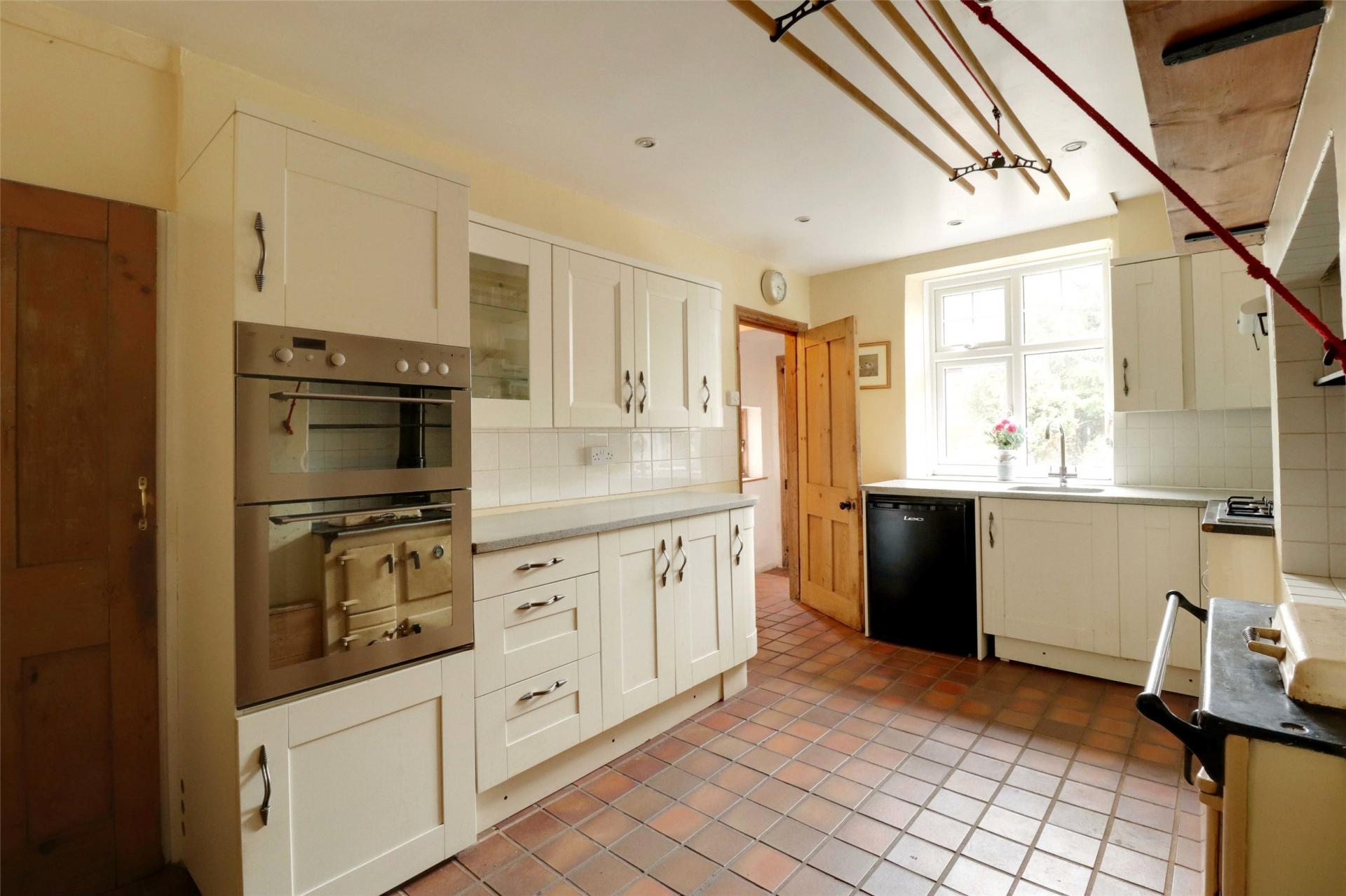 The well-appointed kitchen features an extensive range of wall and base units, an integrated double oven, a gas hob, and an oil-fired Rayburn. There is ample space for a dining table, along with a useful under-stairs larder for additional storage.