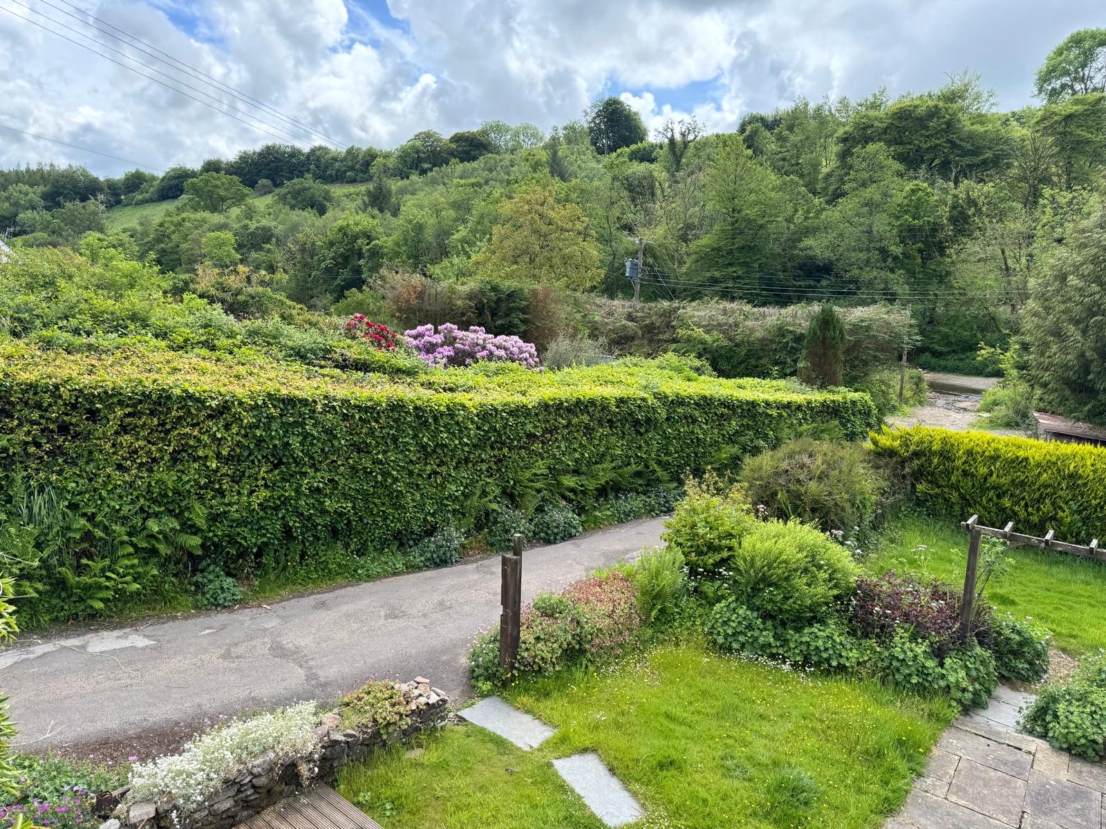To the side of the property, a beautifully secluded garden area features a historic water mill, a waterfall, and pond, creating a truly idyllic setting. This peaceful retreat offers a sense of privacy, allowing you to fully appreciate the views of the surrounding countryside.