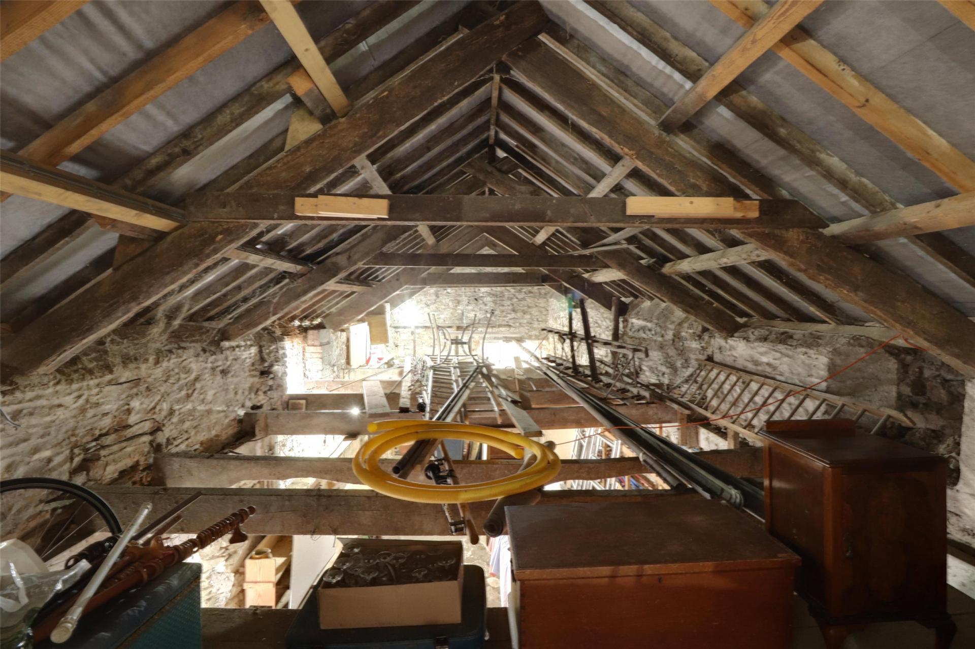 A door from here leads into the impressive attached two-storey barn, which includes plumbing for a washing machine and sink. Beneath the stairs, the original mill cogs remain, adding to the property's unique character.