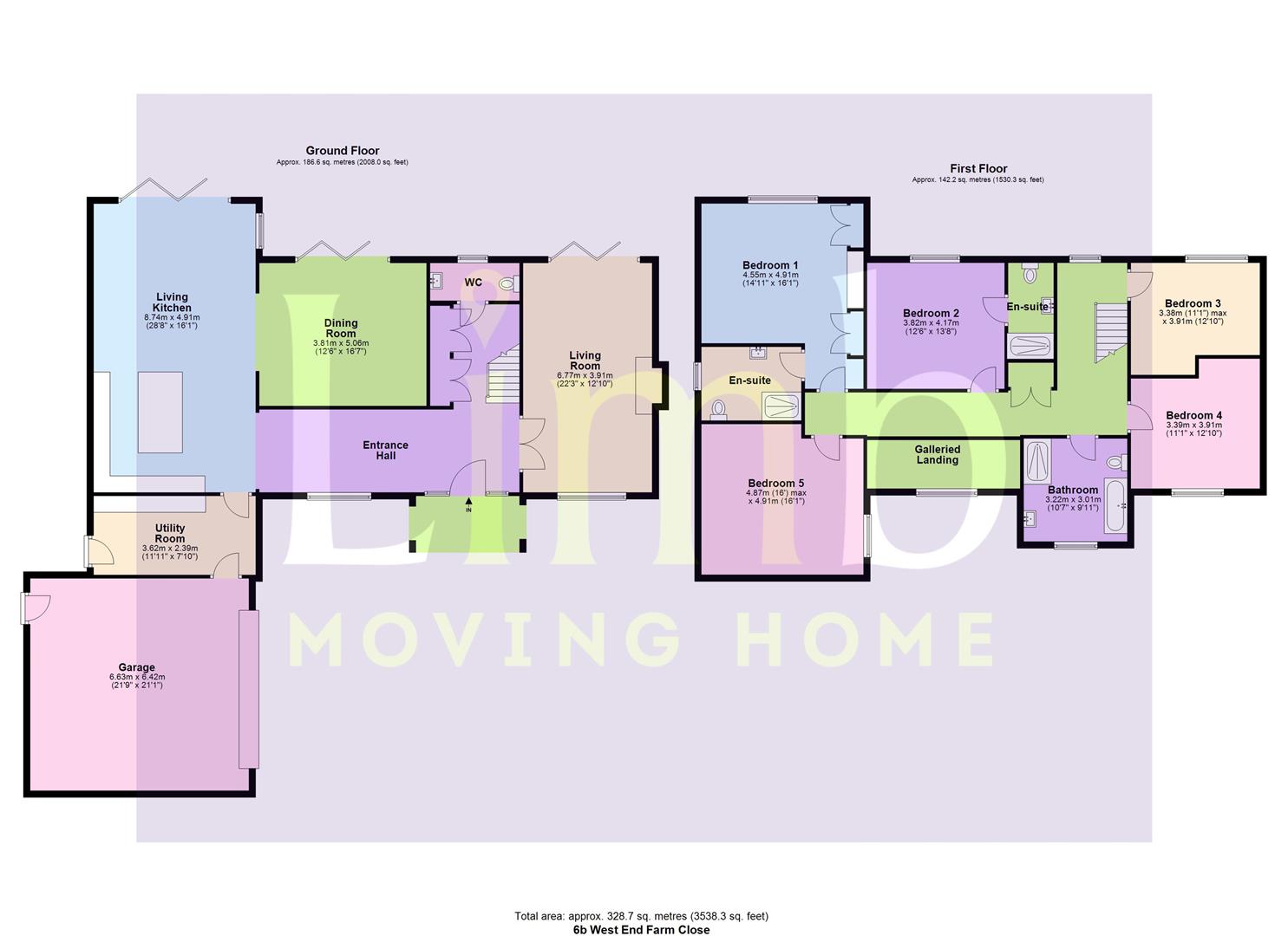 Upstairs, five well-proportioned bedrooms await, two of which boast en-suite facilities, complemented by a luxurious family bathroom. The home benefits from gas-fired underfloor heating on the ground floor and radiator heating upstairs, alongside high-quality uPVC double glazing. The kitchen is fitted with premium appliances, and the majority of the sanitary ware is from Villeroy & Boch.