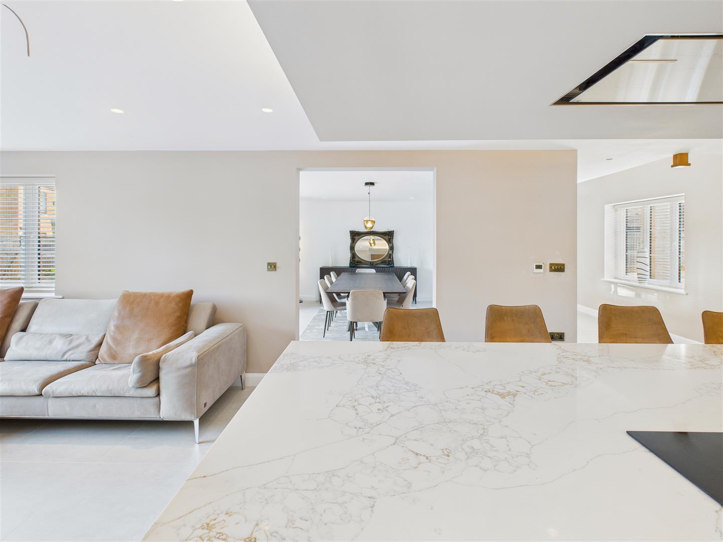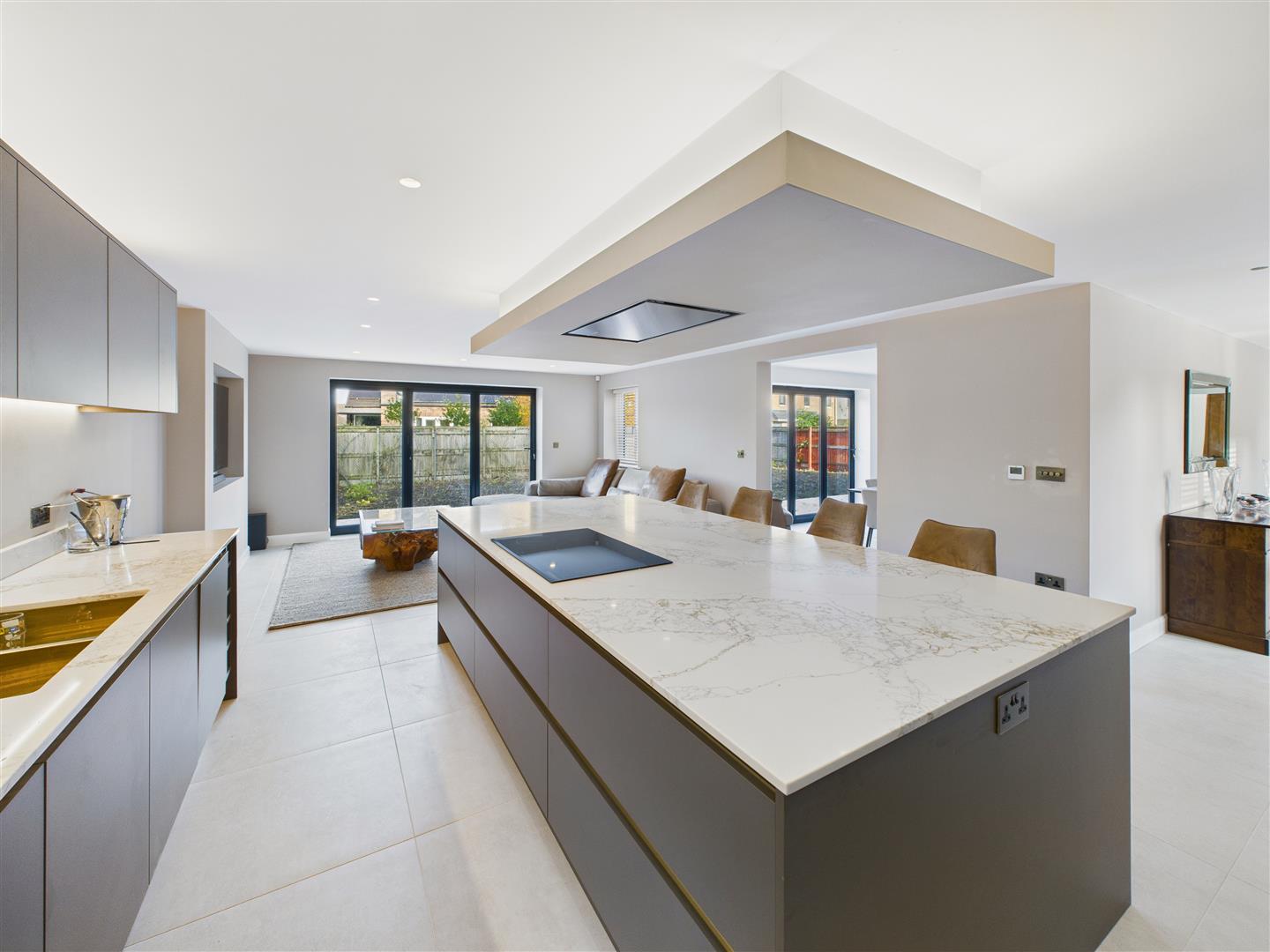 Kitchen/Sitting - An extensive range of contemporary fitted handless units with shadow detailing, grand island all complete with quartz work surfaces including a breakfast bar peninsular. Appliances include twin ovens, combination microwave, induction hob with ceiling mounted extractor above. Integrated dishwasher, fridge, freezer, copper double sink with matching mixer tap. This stunning living kitchen is the heart of the home and has a beautiful tiled floor with underfloor heating and bi-fold doors leading out to a rear patio. A wide opening leads through to the dining room.