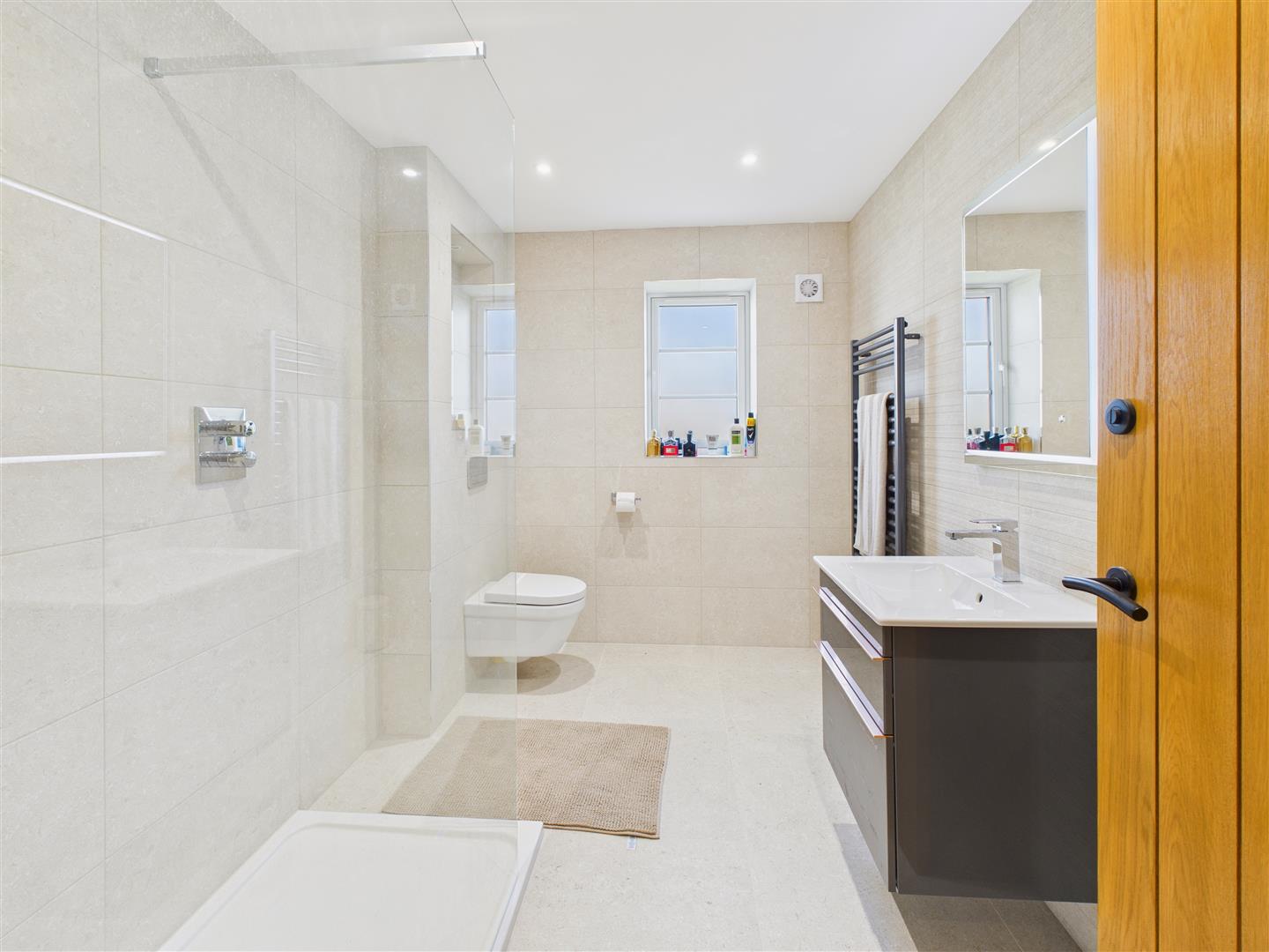 En-Suite - With Villeroy and Boch concealed flush WC and matching wash hand basin in fitted cabinet. Walk in shower area with rain head and hand held shower system, glazed partition. Beautiful tiling to the walls and floor, heated towel rail.