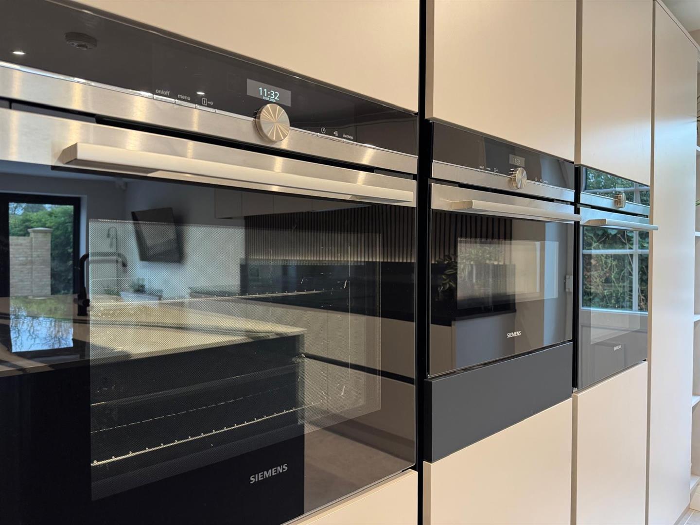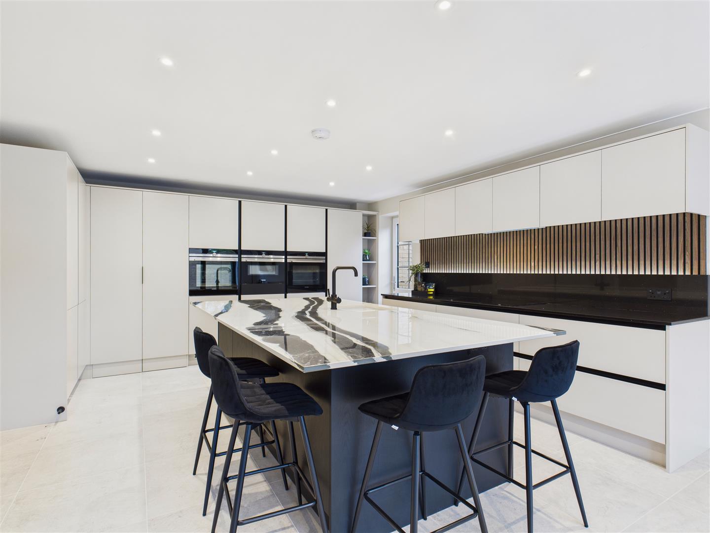 Open Plan Living Kitchen - The heart of the house, this outstanding open plan space features a stunning central island with beautiful marble top having an inset one and a half ceramic sink and mixer tap with instant hot water feature. An extensive range of sleek, contemporary units are complemented by a quartz worksurface housing a NEFF induction hob with concealed extractor hood above. A bank of units house further integrated appliances including twin ovens, a combination oven/microwave and twin fridge/freezers. There is a concealed entrance through to the garage. A tiled floor extends throughout and there are triple bi-fold doors opening out to the rear garden.