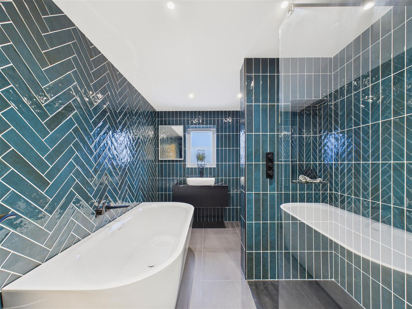 Bathroom - A superb main bathroom with feature tiling to the walls, tiled floor and suite comprising an oval shaped bath, walk in shower area with rain head and hand held shower system, glazed partition, concealed flush W.C. and cabinet with wash hand basin and mixer tap. Mirror to wall, heated towel rail.