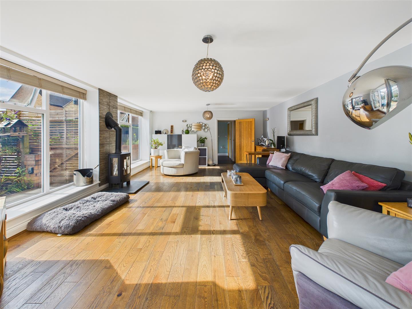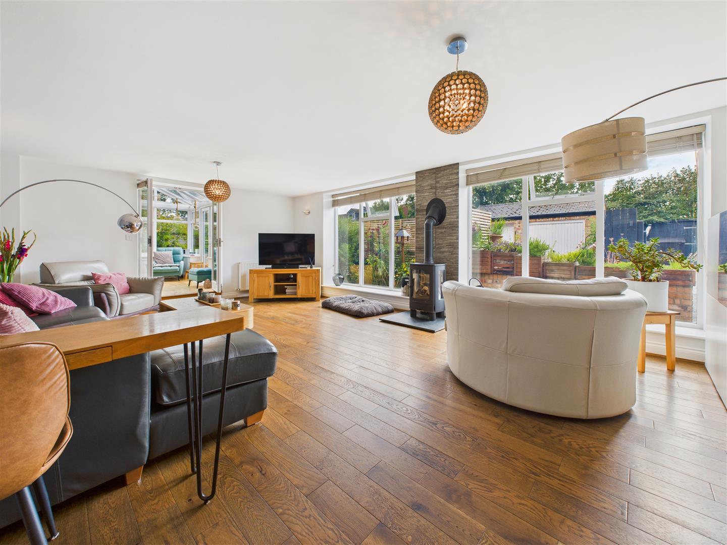 Living Room - A stunning, spacious area with two picture windows to the front, attractive wood-effect floor and a log burner to the centre with a slate hearth and tiled surround.