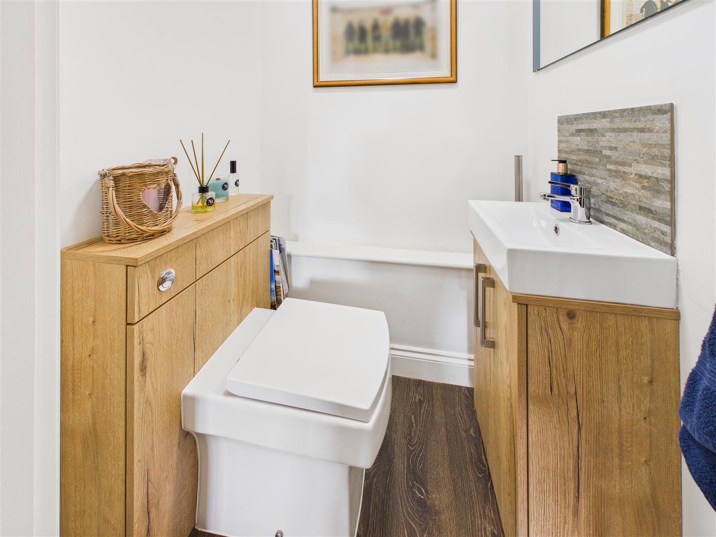 Bathroom - Contemporary suite comprising bath, low-flush W.C., wash-hand basin atop fitted vanity unit, panel bath beneath Velux window to the front elevation and shower enclosure to the corner. The room also benefits from a heated towel rail and tiled surround and flooring.