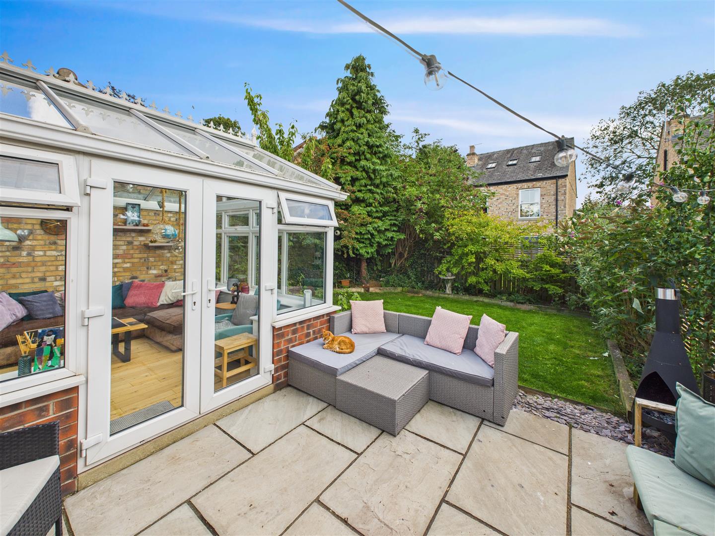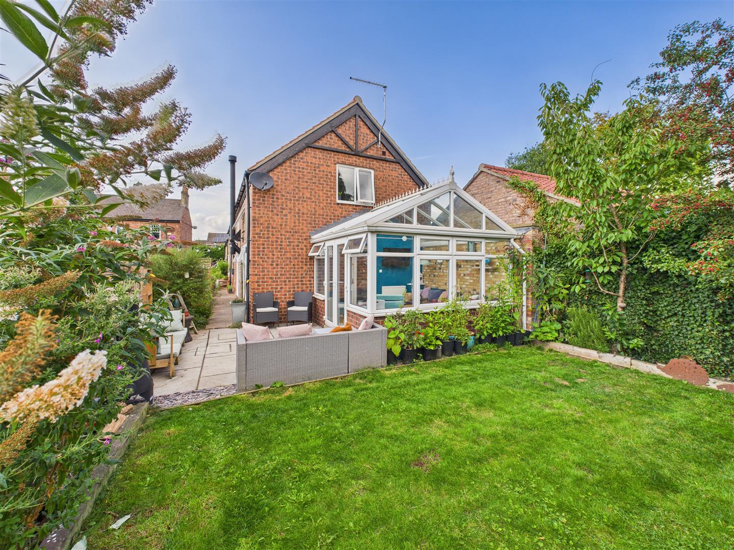 Garden Conservatory - Of uPVC glazed construction with brick wall to one side, glass roof and French doors leading out onto the garden.