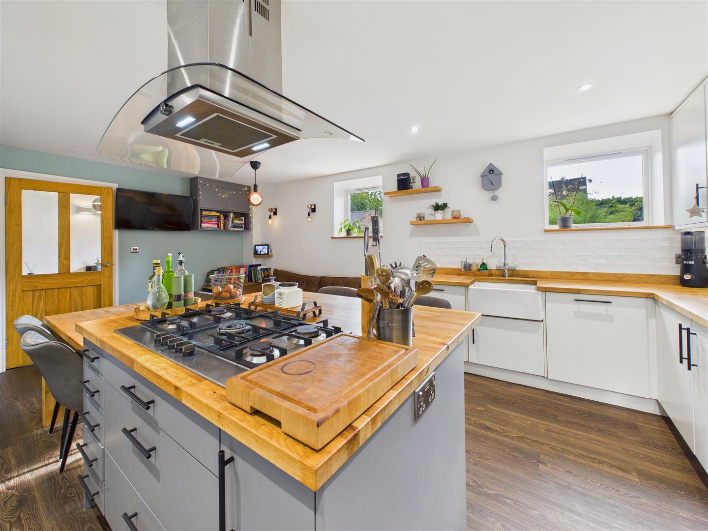 Dining Kitchen - Featuring an excellent range of contemporary white-matte fronted base and wall mounted units with oak worksurfaces throughout, the kitchen space briefly comprises a Belfast sink beneath two windows to the front, integrated double combi-oven, integrated fridge-freezer, two integrated dishwashers and pantry cupboard to the corner. An island lies at the centre hosting a five-ring gas hob with extractor chimney above, breakfast bar area and dining table with the option to extend by use of a hinge. A cupboard lies to the corner with plumbing for a washing machine.