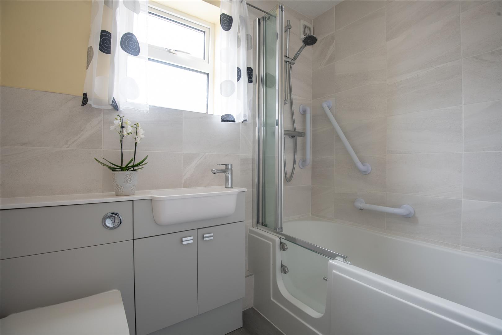 Bathroom - With suite comprising a bath with shower over and screen, vanity unit with wash hand basin and low flush W.C. Part tiling to walls, window to side.