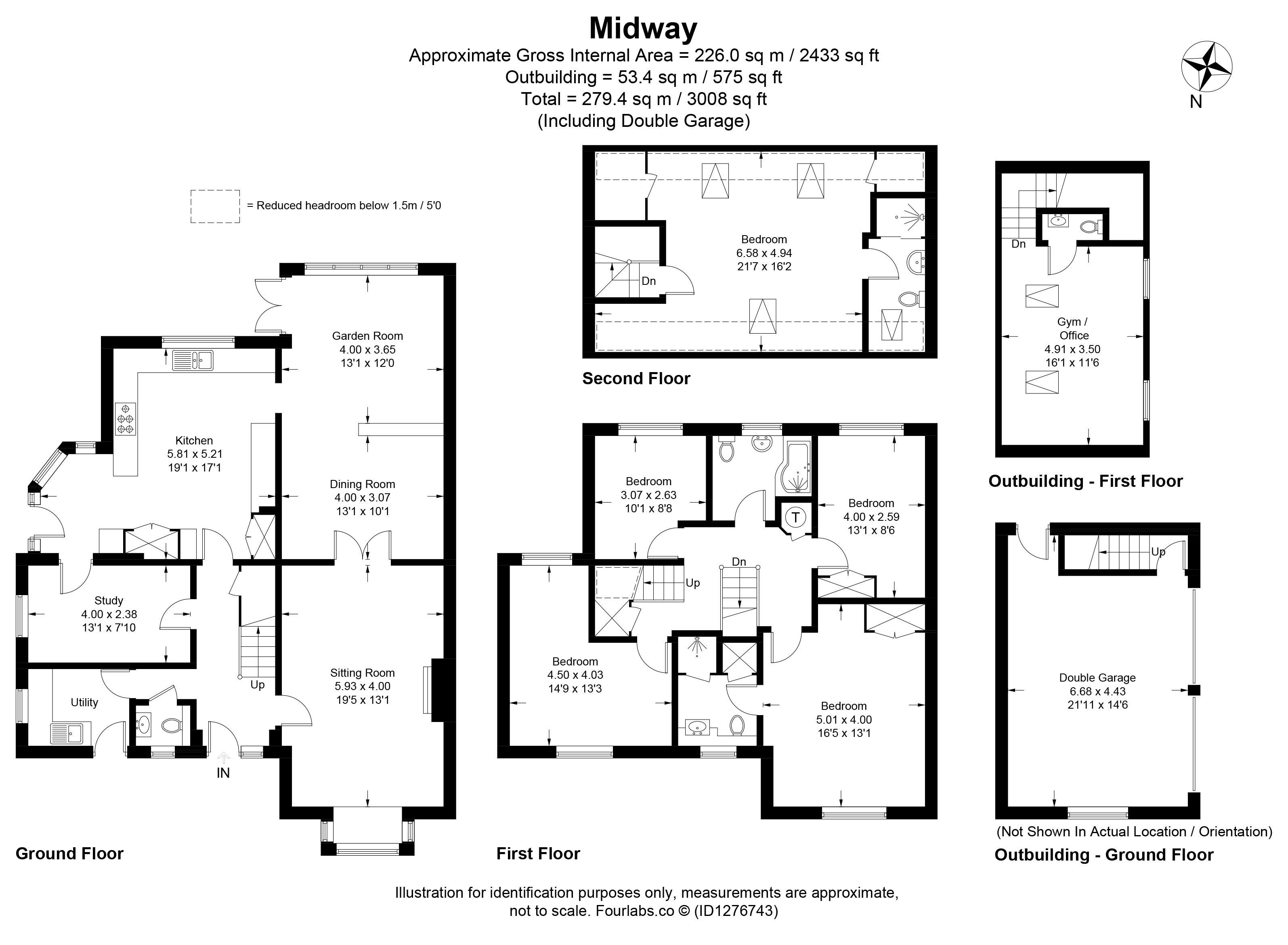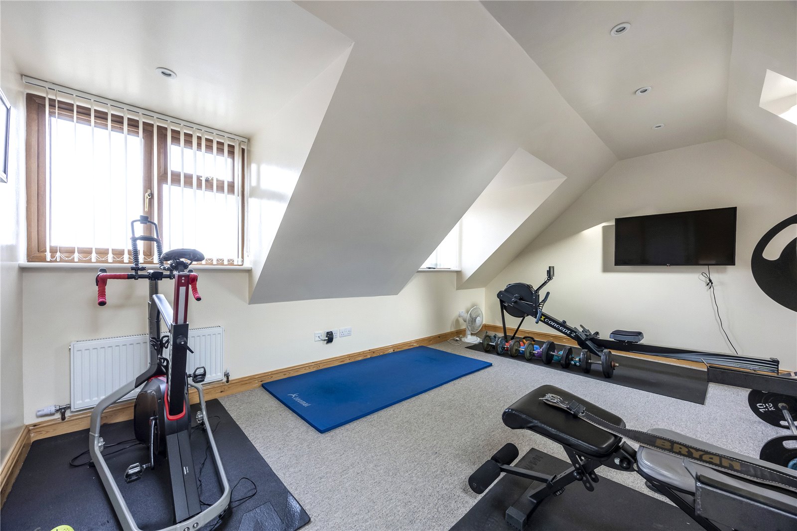 To the front, a spacious driveway provides off-road parking for several vehicles and leads to a double garage fitted with electric doors, power, and lighting. Stairs rise to an impressive, versatile space above, currently arranged as a home gym, complete with a separate WC.