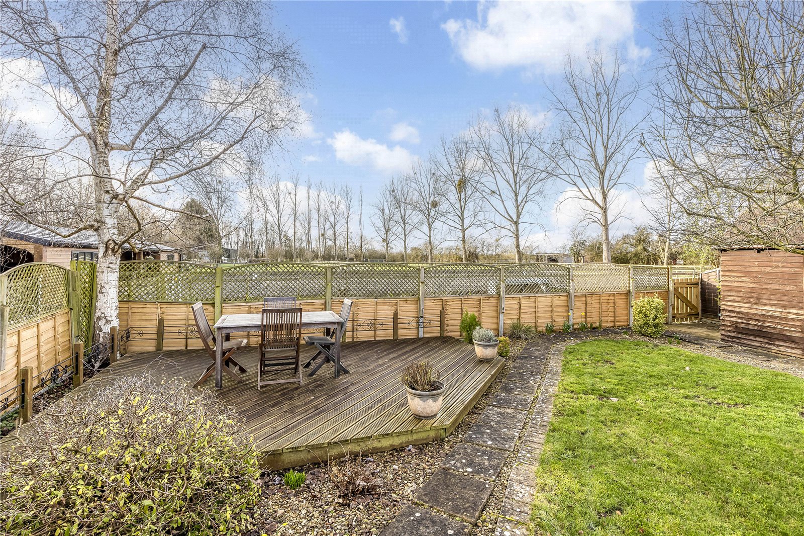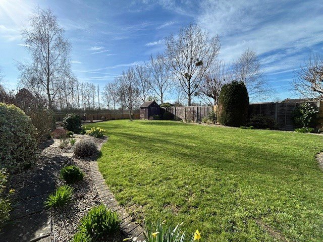 The rear garden features a patio area with gated side access, a generous central lawn bordered by mature planting, a potting shed, and delightful open fields beyond, providing a wonderful outlook and sense of privacy.