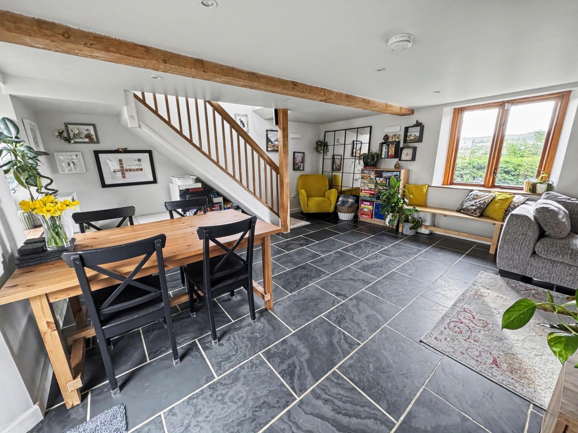 - Generous Living/Dining Space – Open-plan ground floor flooded with natural light, slate flooring, underfloor heating, and dual aspect windows framing countryside views.