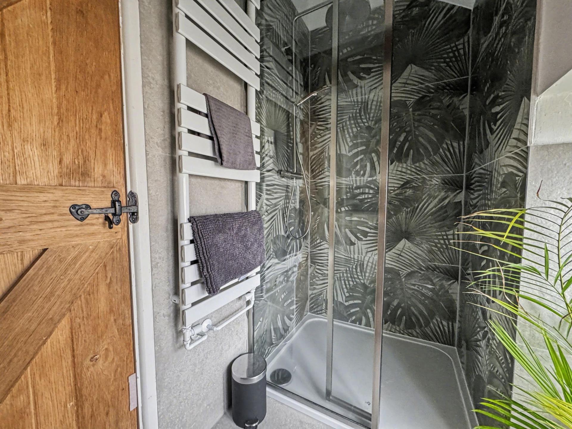 - Main Bedroom with En-Suite – Feature ‘A’-frame truss, en-suite shower room with stone tiles, double shower, vanity washbasin, and ladder-style radiator.