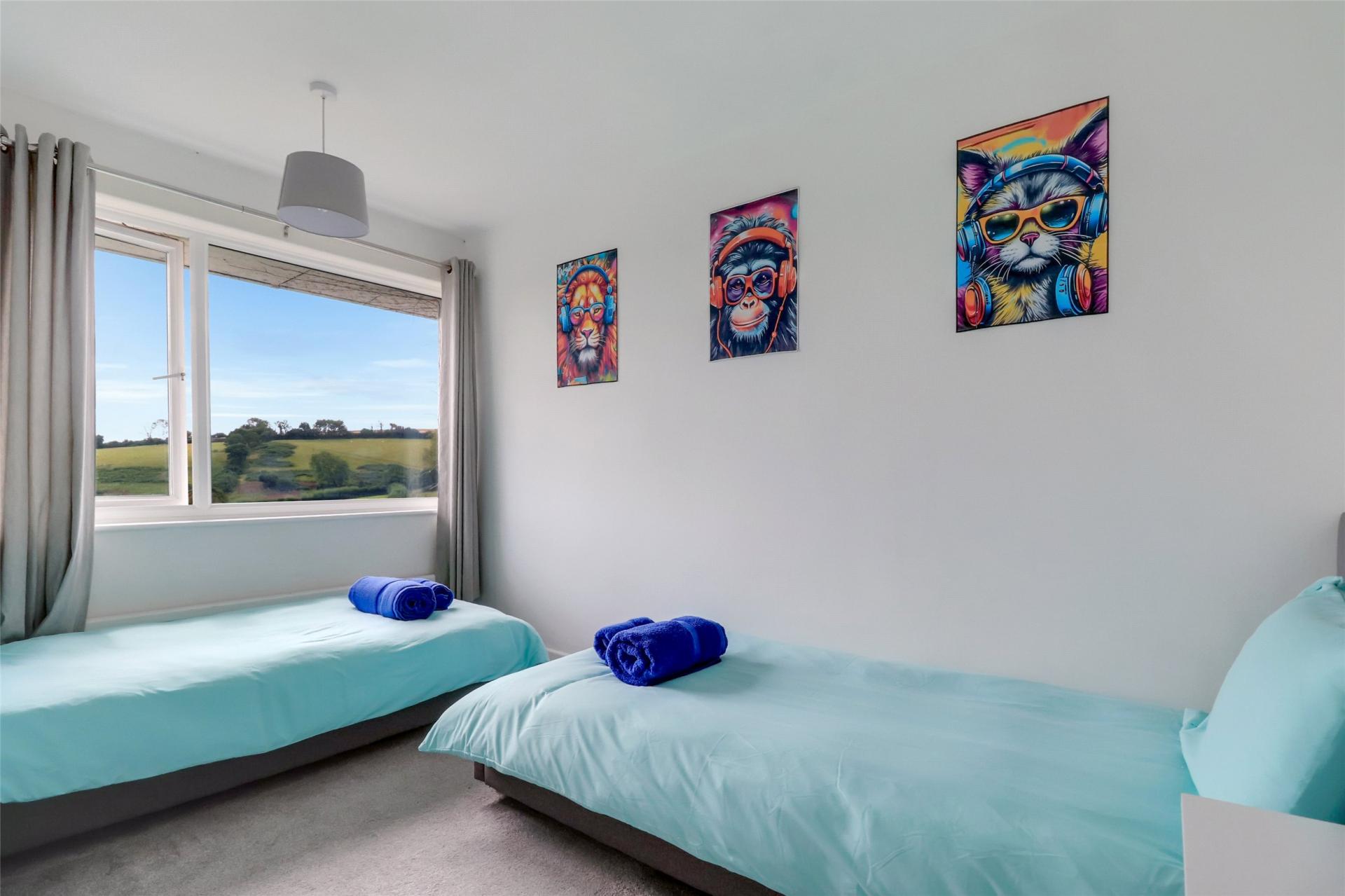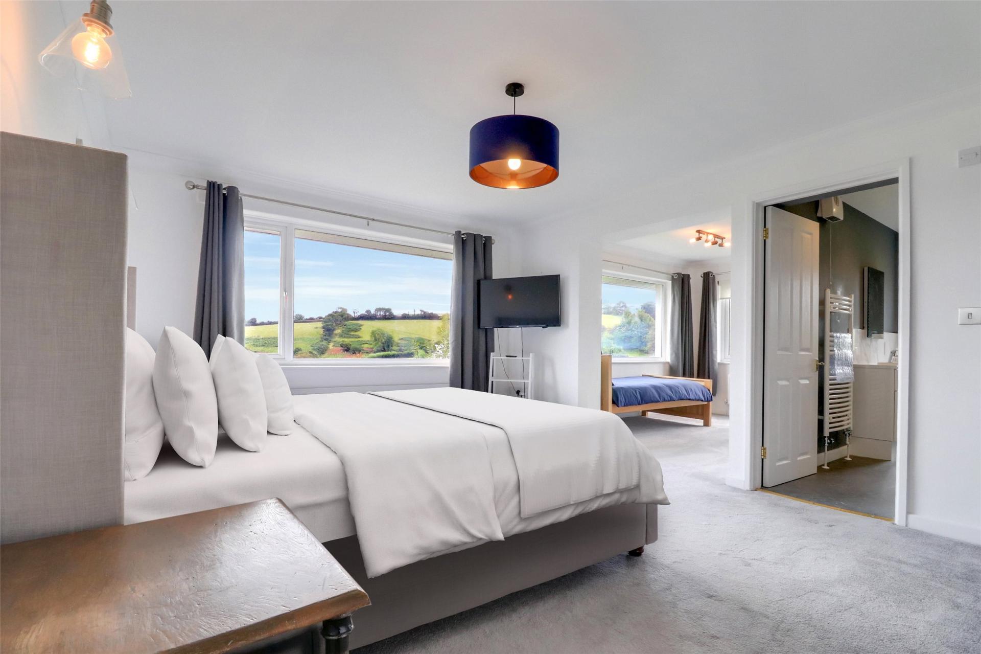 At the far end of the house, a beautiful curved doorway leads into another reception room. Currently used as a spacious home office, this room is well-equipped with storage and shelving but could easily serve as a snug or an additional bedroom if needed. This room has charming features, such as a circular feature window, but the views over the rear garden and the countryside beyond can be enjoyed year-round.