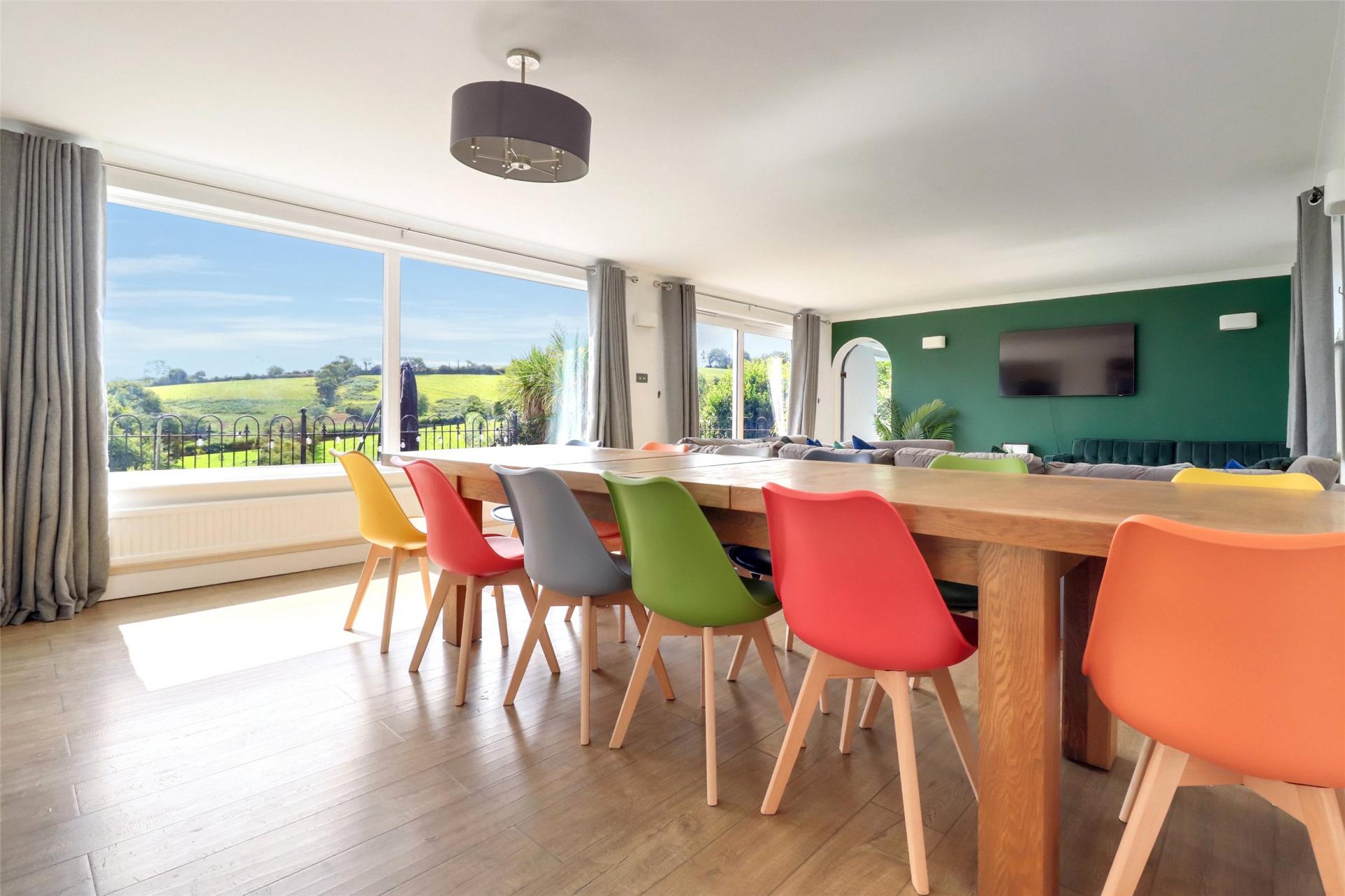 A sweeping, gated driveway leads you to the home, where a large porch welcomes you inside. Upon entering, you step into the impressive 30-foot (approx.) living and dining room, featuring large windows and sliding doors that open onto the terrace, showcasing spectacular views over the open countryside.