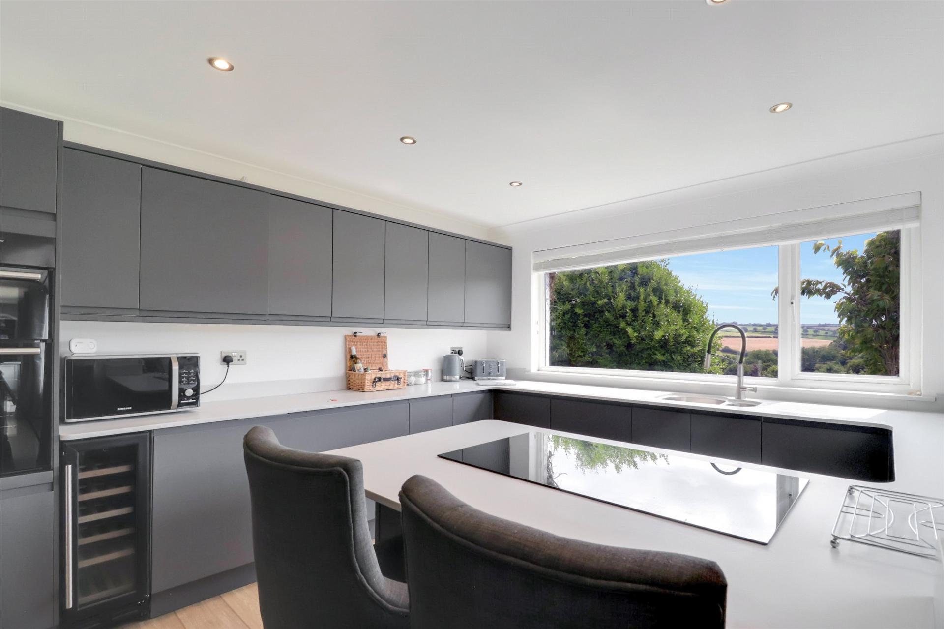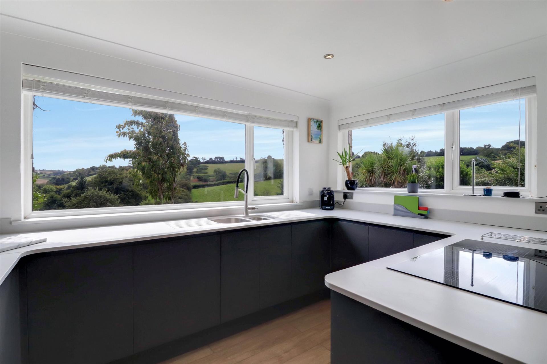 The kitchen is fitted with modern, matching wall and base units, an integrated double oven, hob, and dishwasher, along with a convenient breakfast bar area. The views from the kitchen are simply breathtaking. At the rear of the kitchen, a door opens into a practical utility room, which offers additional wall and base units, plus plumbing and space for white goods. There is also a rear hall that benefits from a WC and a door leading out to the side of the property, with a covered porch, boiler room, and store cupboard.