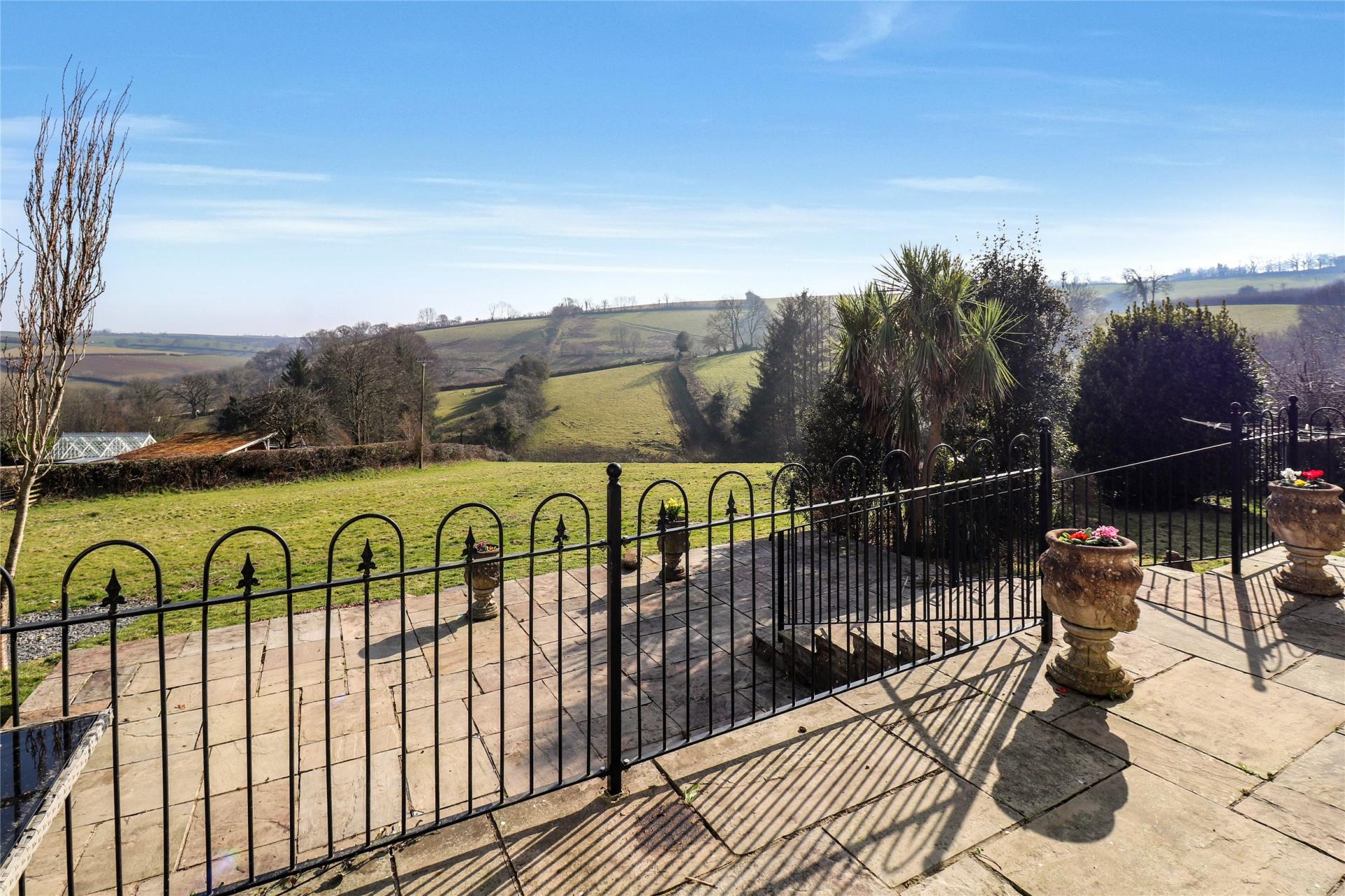 The property also benefits from a private gated driveway, offering ample parking for multiple vehicles. The surrounding grounds are equally impressive. At the rear, a large terrace with central steps leads down to a lawn and paddock, offering expansive views of the open countryside. The gently sloping paddock, measuring just over an acre in total, presents opportunities for those interested in keeping animals, such as a pony paddock, or simply enjoying a large family garden.