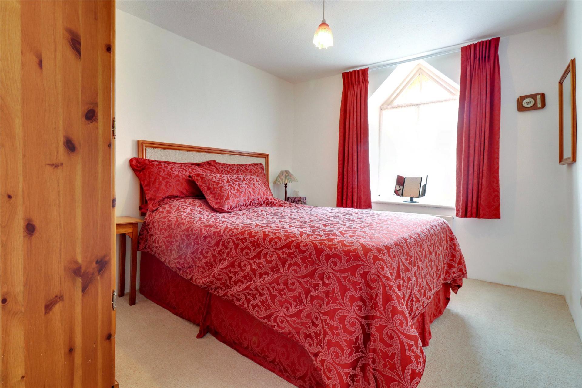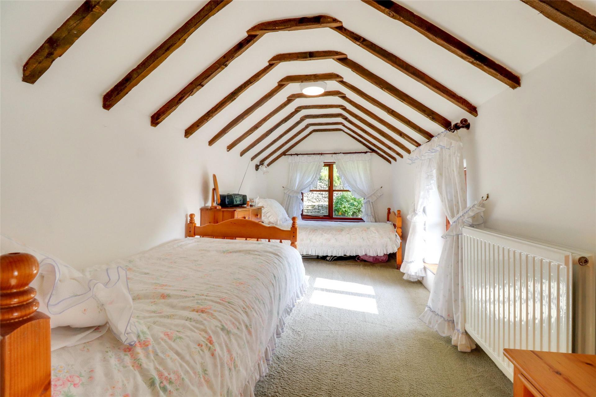 Upstairs, a split-level landing leads to two double bedrooms, a bathroom, and a storage cupboard. The main bedroom is a spacious double with a front-facing gothic-style window and exposed timber beams. The second bedroom is also a generously sized double with dual aspect windows, and ample space for furniture. The partly tiled bathroom includes a WC, washbasin, and a bath with a shower attachment.