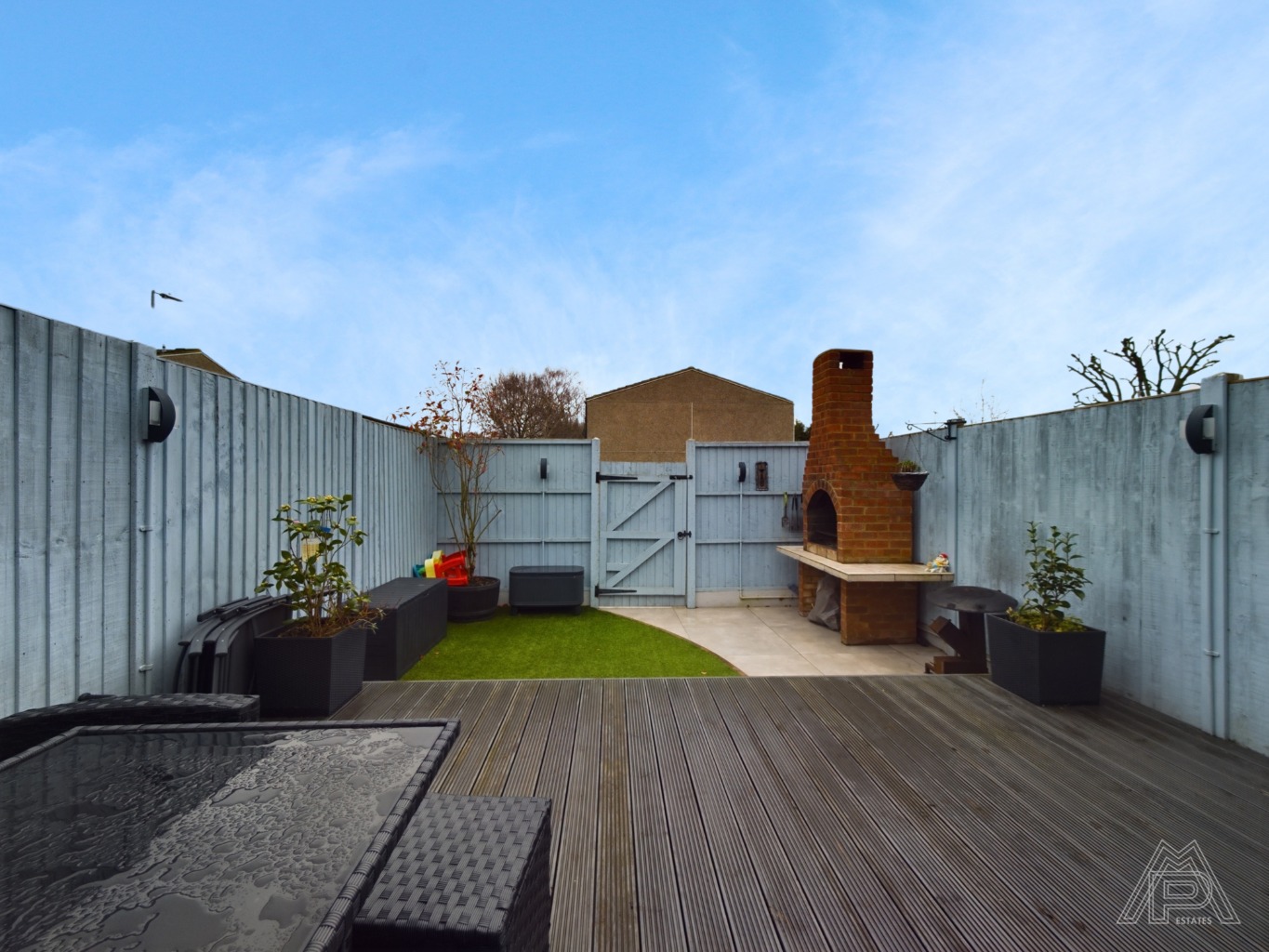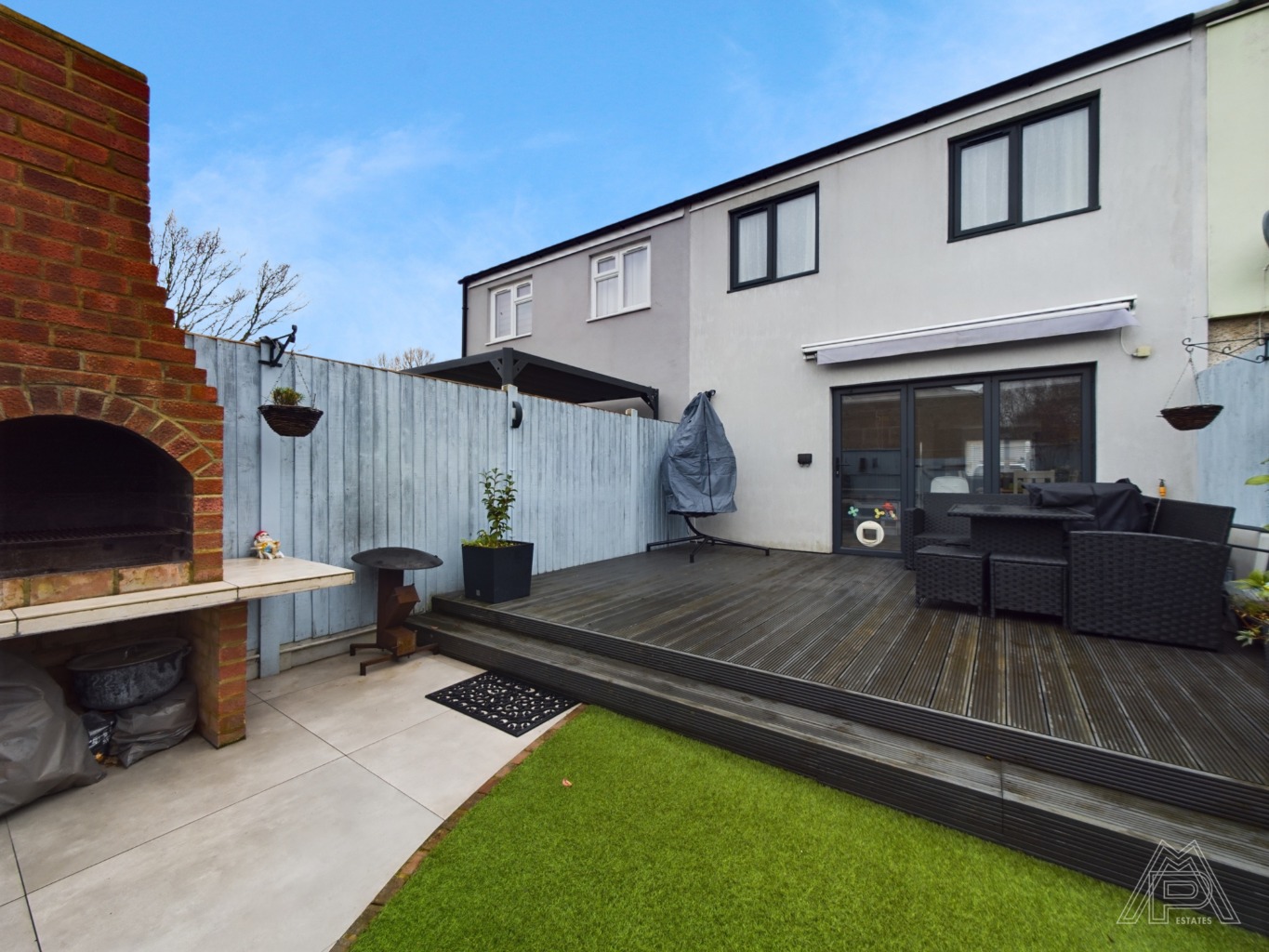 Externally, the house features a rear garden with decking and a built-in barbecue, perfect for summer hosting and entertaining. At the front, additional storage is provided through a garage, along with off-street parking.