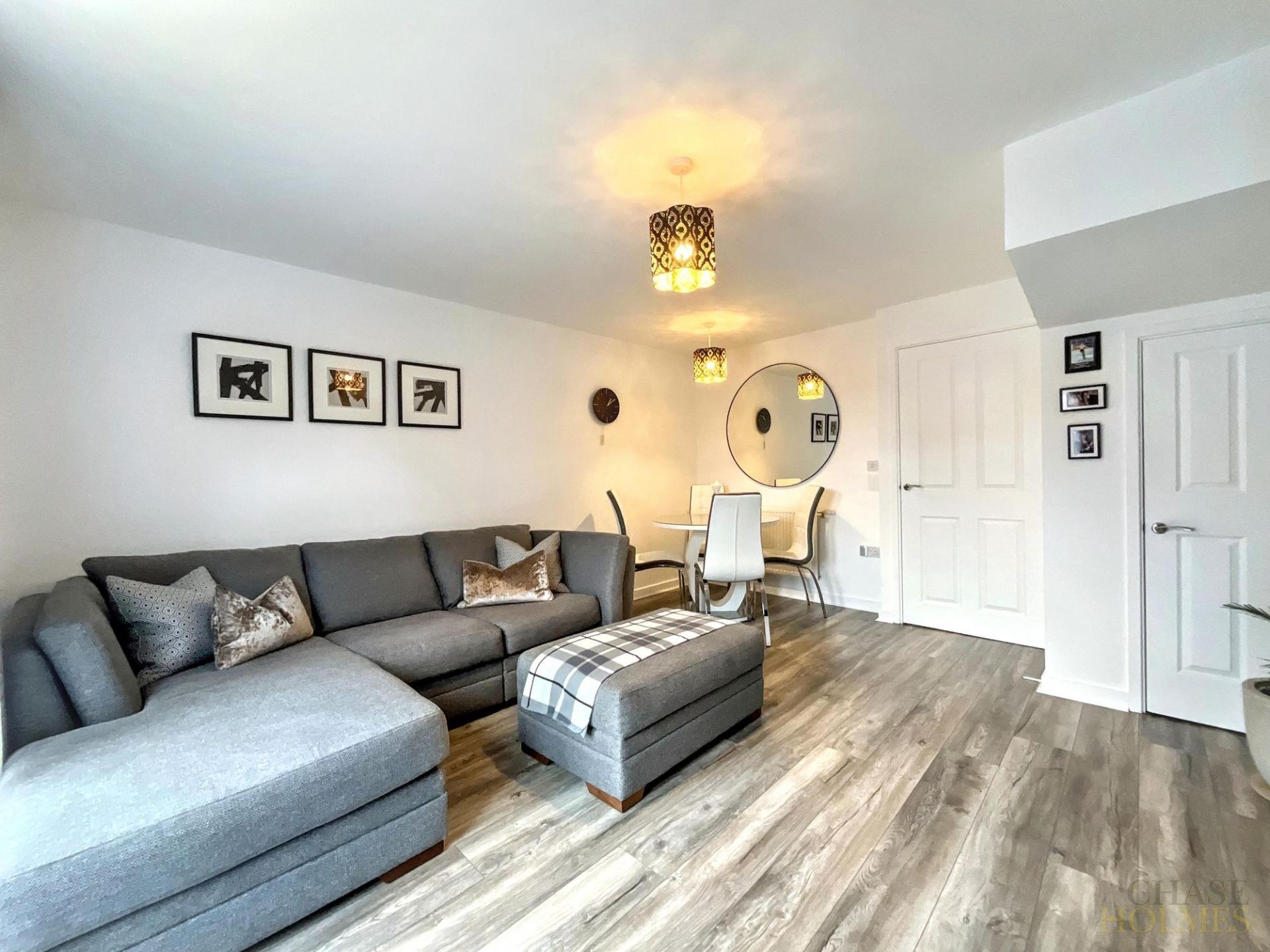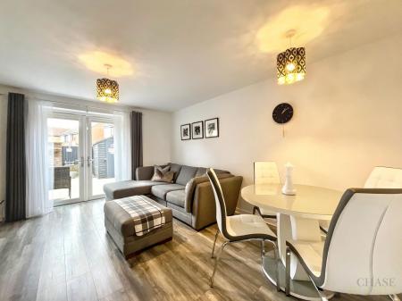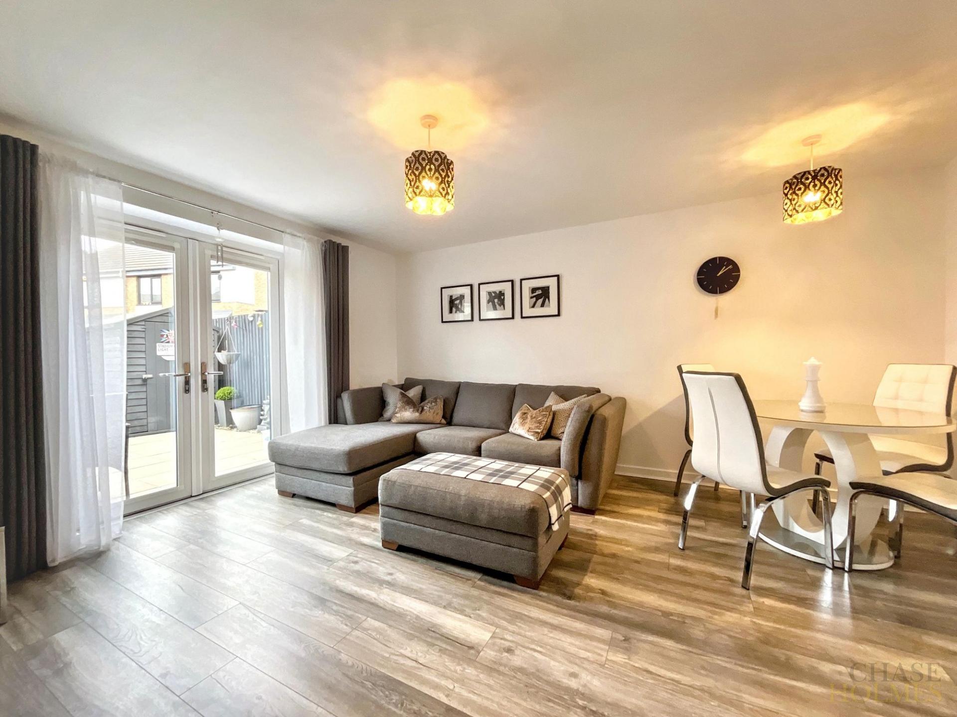 Upon entering, you are greeted by an inviting open plan living and dining area, thoughtfully designed to maximise space and functionality while providing a comfortable setting for both relaxing and entertaining. Large French patio doors allow for an abundance of natural light to flood the interior, enhancing the modern decor and creating a bright, airy atmosphere throughout the property.