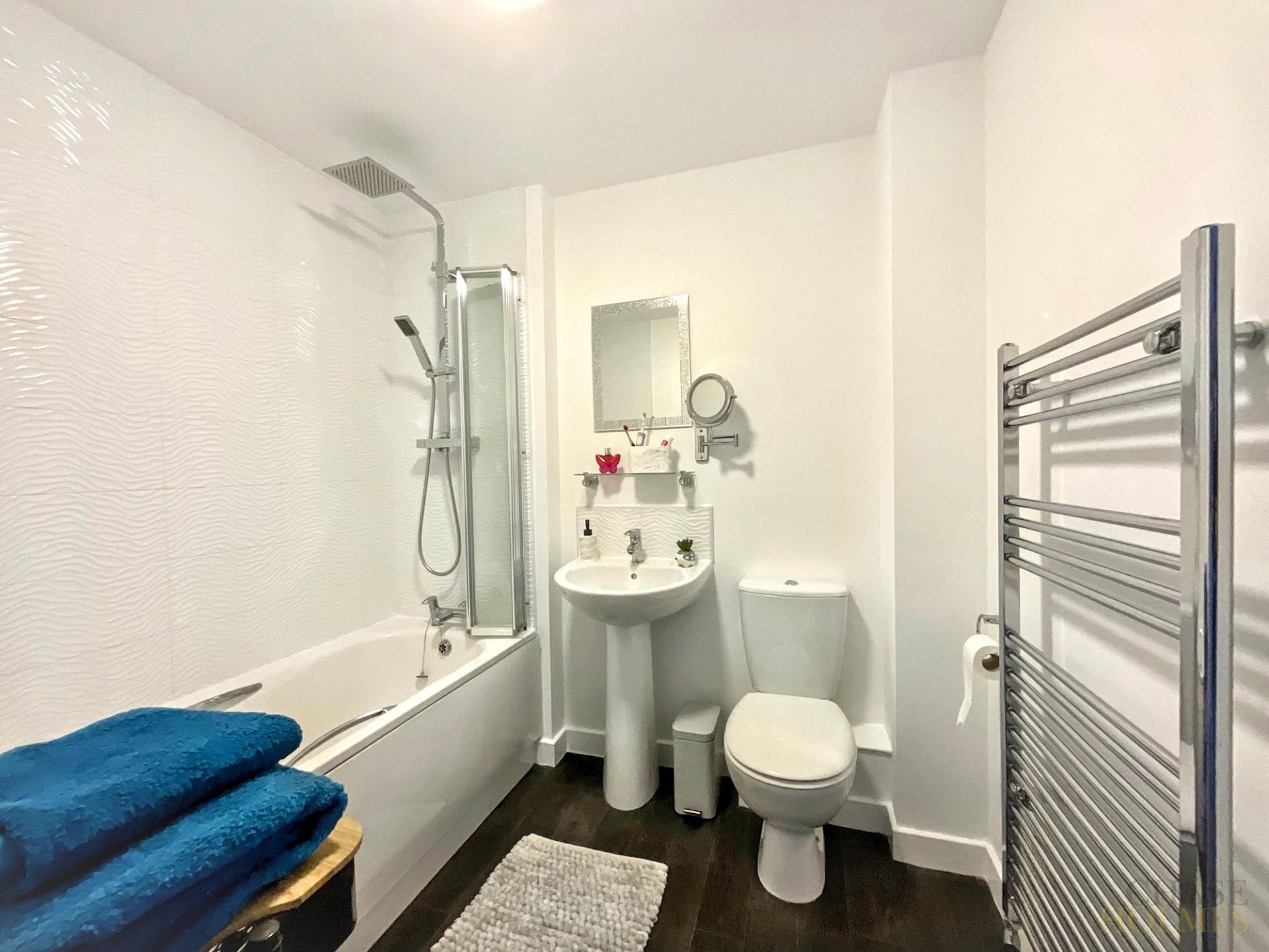 The bright, modern bathroom features a clean white design with a full-size bathtub and overhead shower, dark flooring contrasts nicely with the light walls bringing a cozy, welcoming touch.