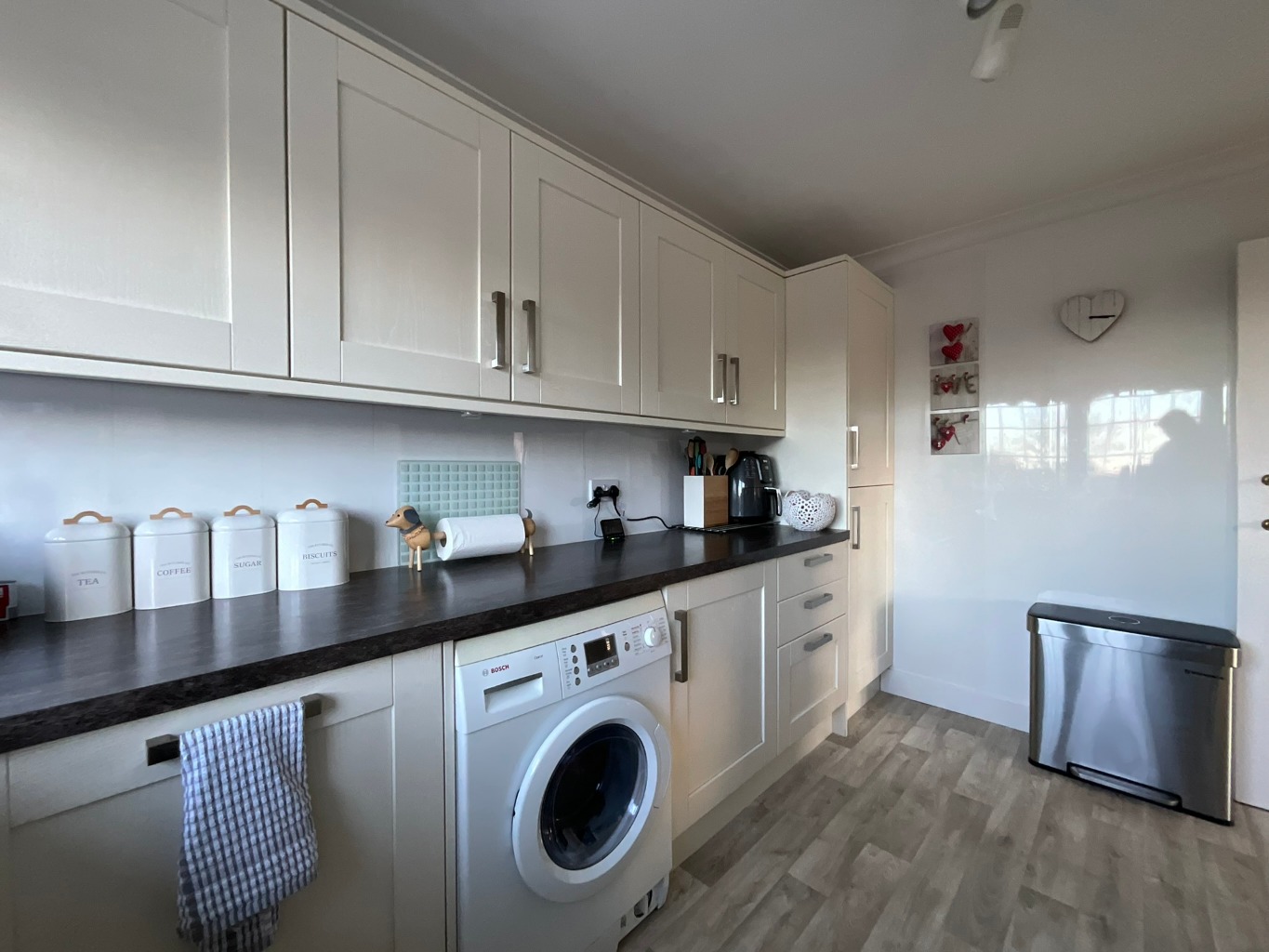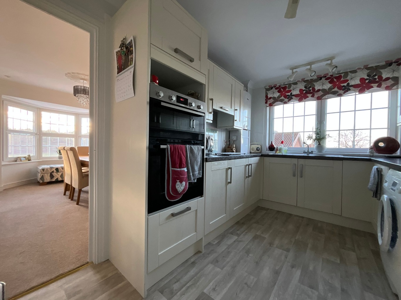 Kitchen (3.66m x 2.51m)With range of wall and floor units with contrasting work surfaces, extractor hood, electric hob, electric oven, integrated washer/dryer, stainless steel 1 1/2 bowl sink with mixer tap and drainer, integrated fridge freezer, integrated dishwasher, stainless steel splashback, UPVC double glazed window, coving to ceiling.
