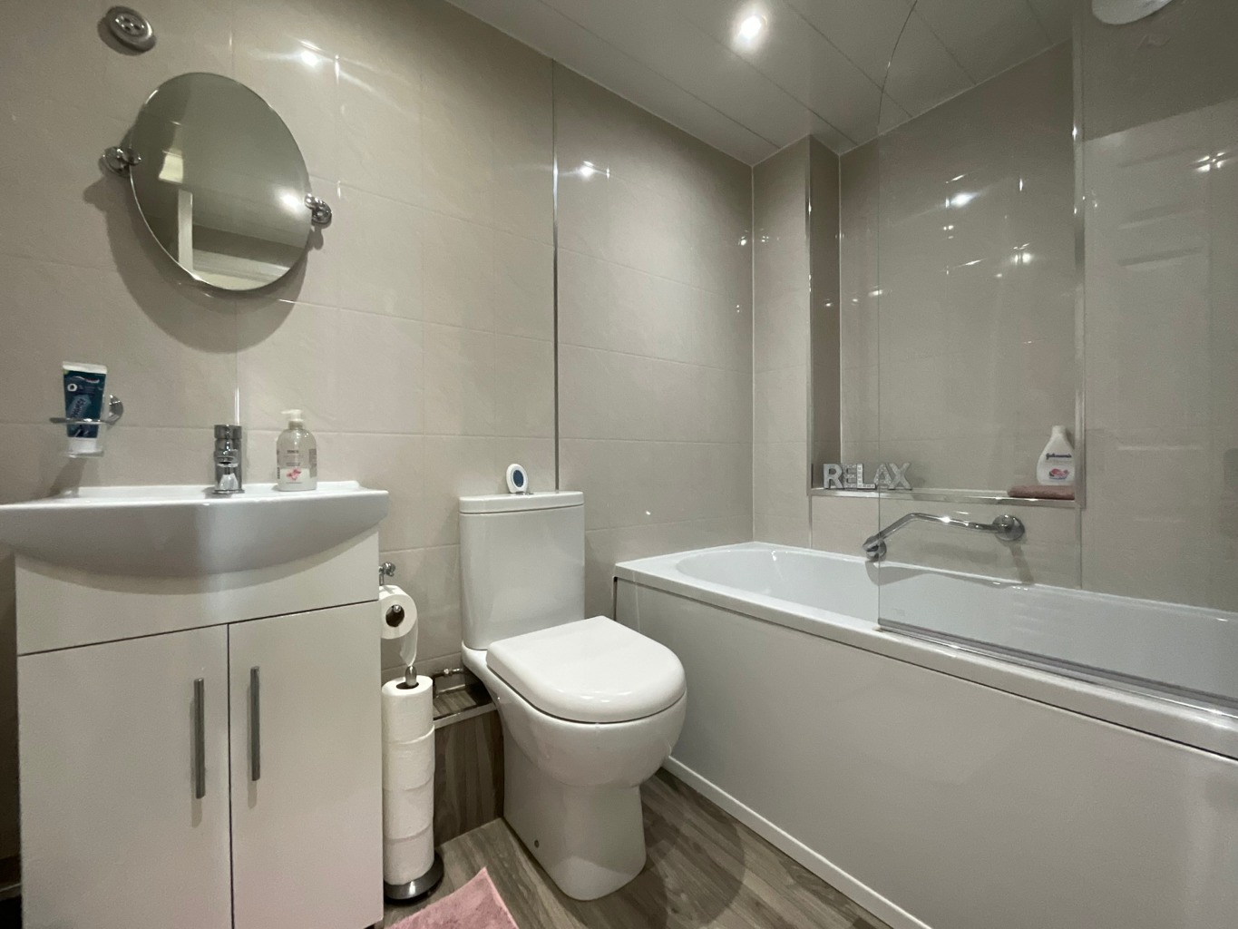 Bathroom (1.67m x 2.36m)White three piece suite with panelled bath with mixer tap, glass shower screen, low level WC, vanity sink unit with mixer tap, tiled walls, heated towel rail, plastic cladding to ceiling, spotlights to ceiling, laminate vinyl tiled flooring, extractor fan.