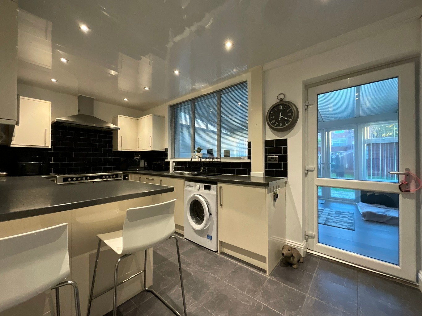Kitchen (5.77 x 2.56)Spot lights to ceiling, range of wall and floor units with complimenting work surfaces, sink with mixer tap and drainer, oven, hob, extractor hood, storage cupboard, UPVC door to conservatory.