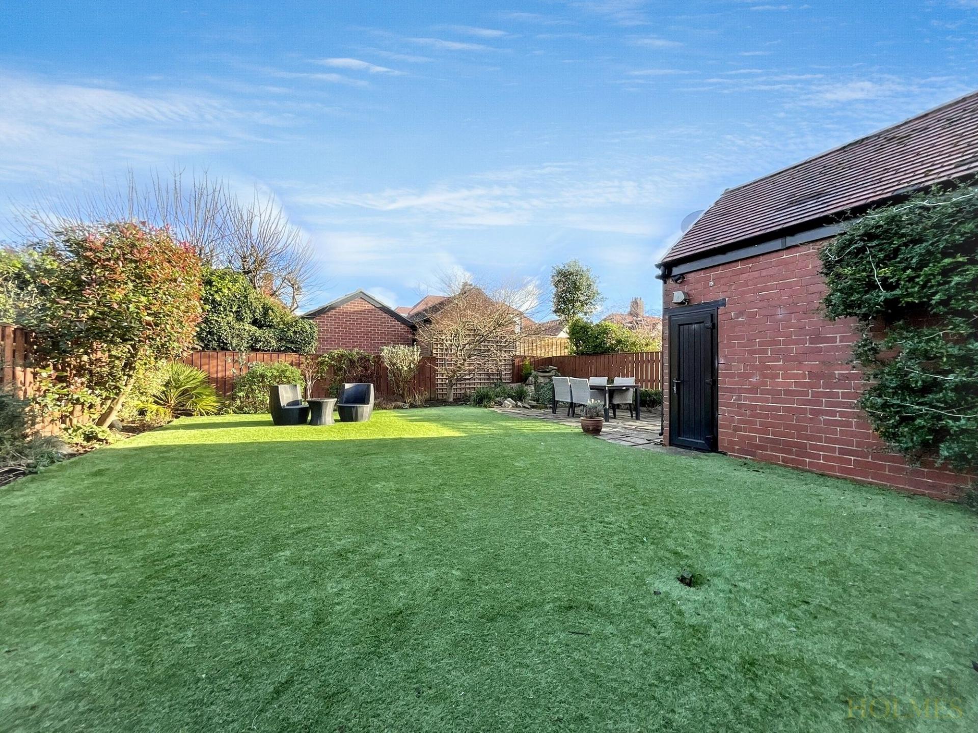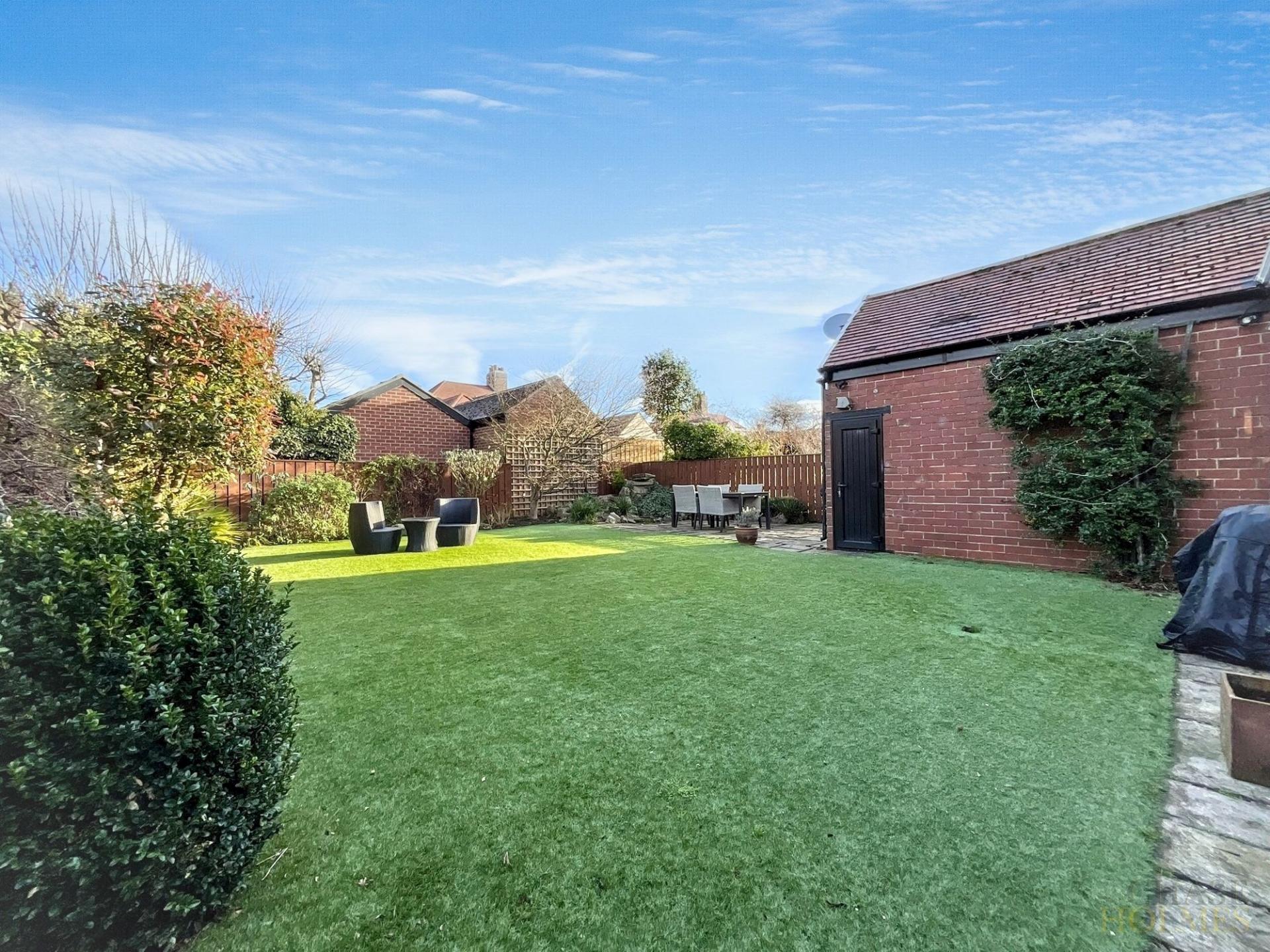 The front garden is beautifully manicured, with artificial lawn and ornamental borders creating an inviting first impression. Wrought iron gates open to a private driveway, leading to the detached garage and further enhancing the sense of exclusivity and security.