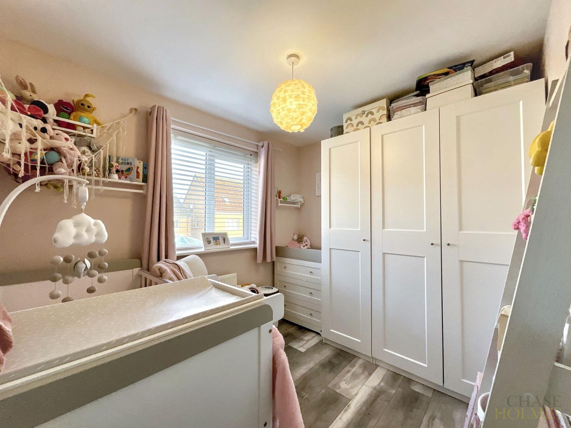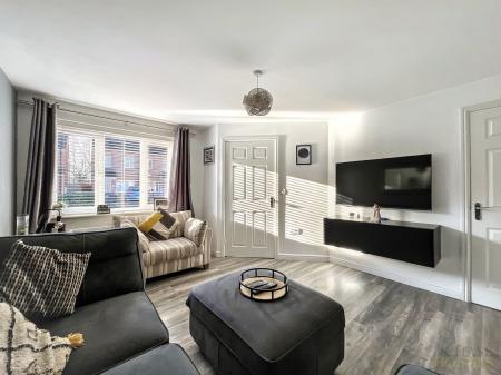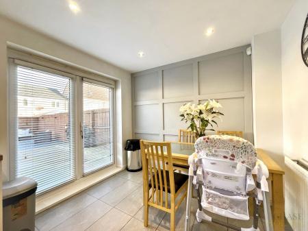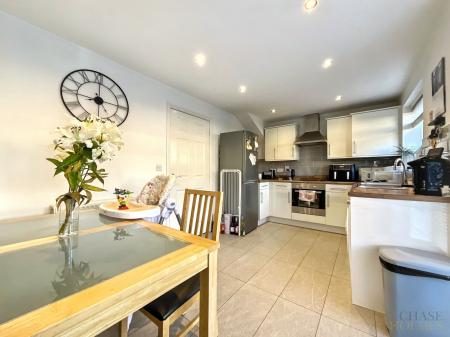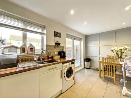 The heart of the home is the open plan kitchen and dining area, featuring modern kitchen units, integrated appliances, and ample workspace. French doors from the dining area provide seamless access to a well-designed patio. The low-maintenance garden, laid with artificial grass and patio, ensures year-round enjoyment with minimal upkeep.