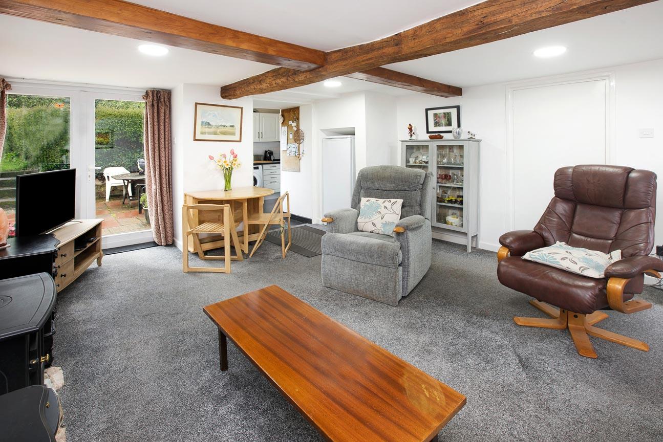 SITTING/DINING ROOM: 5.11m x 4.55m (16'9" x 14'11"), uPVC double glazed window to the front, feature beams to ceiling, radiator, uPVC double glazed doors to the garden and open to: