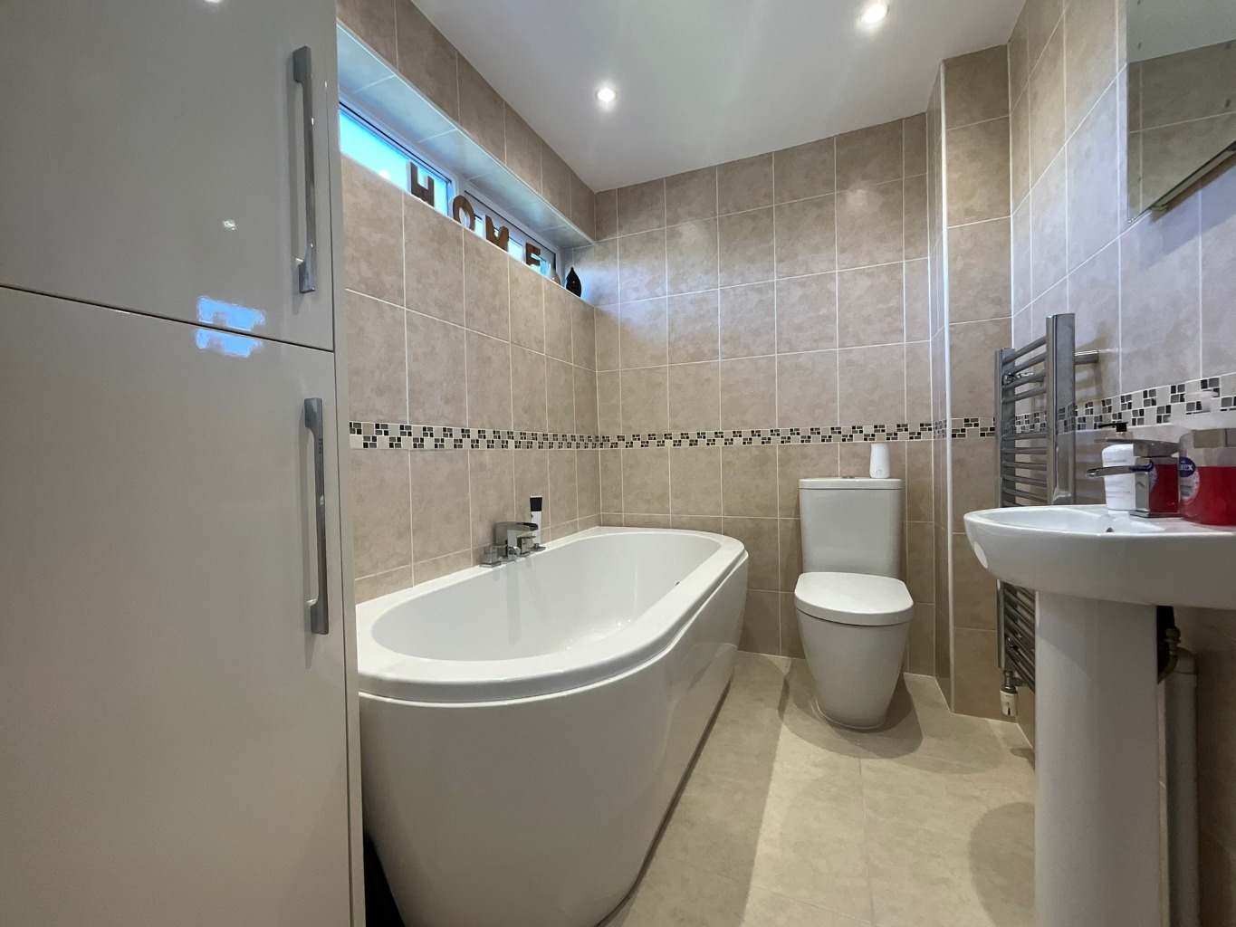 Bathroom (2.42 x 1.66)Features: UPVC double glazed window, panelled bath, low level WC, pedestal hand wash basin, heated towel rail, storage cupboard.