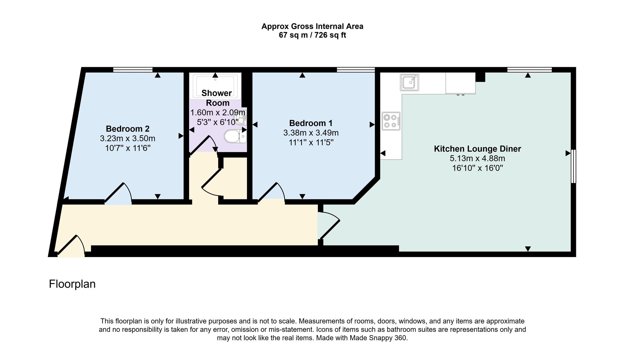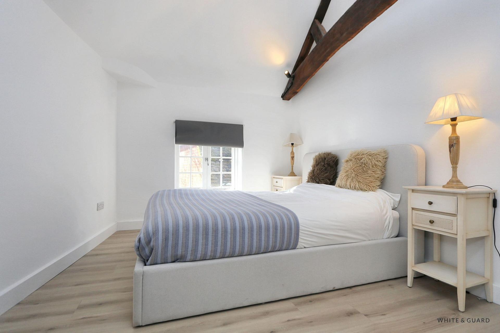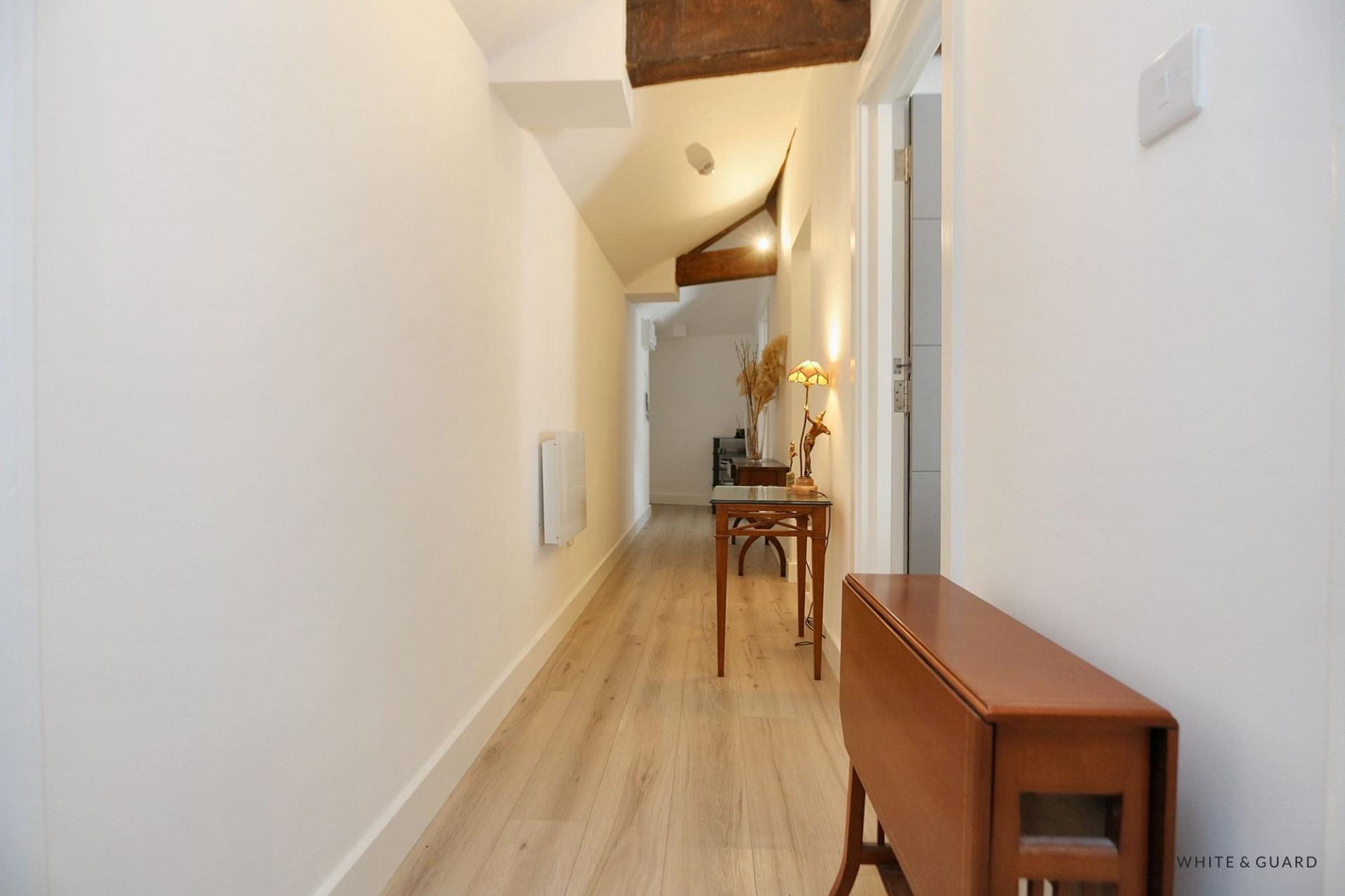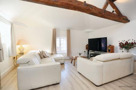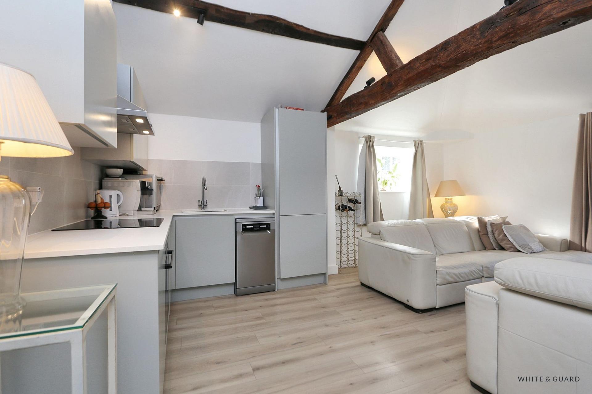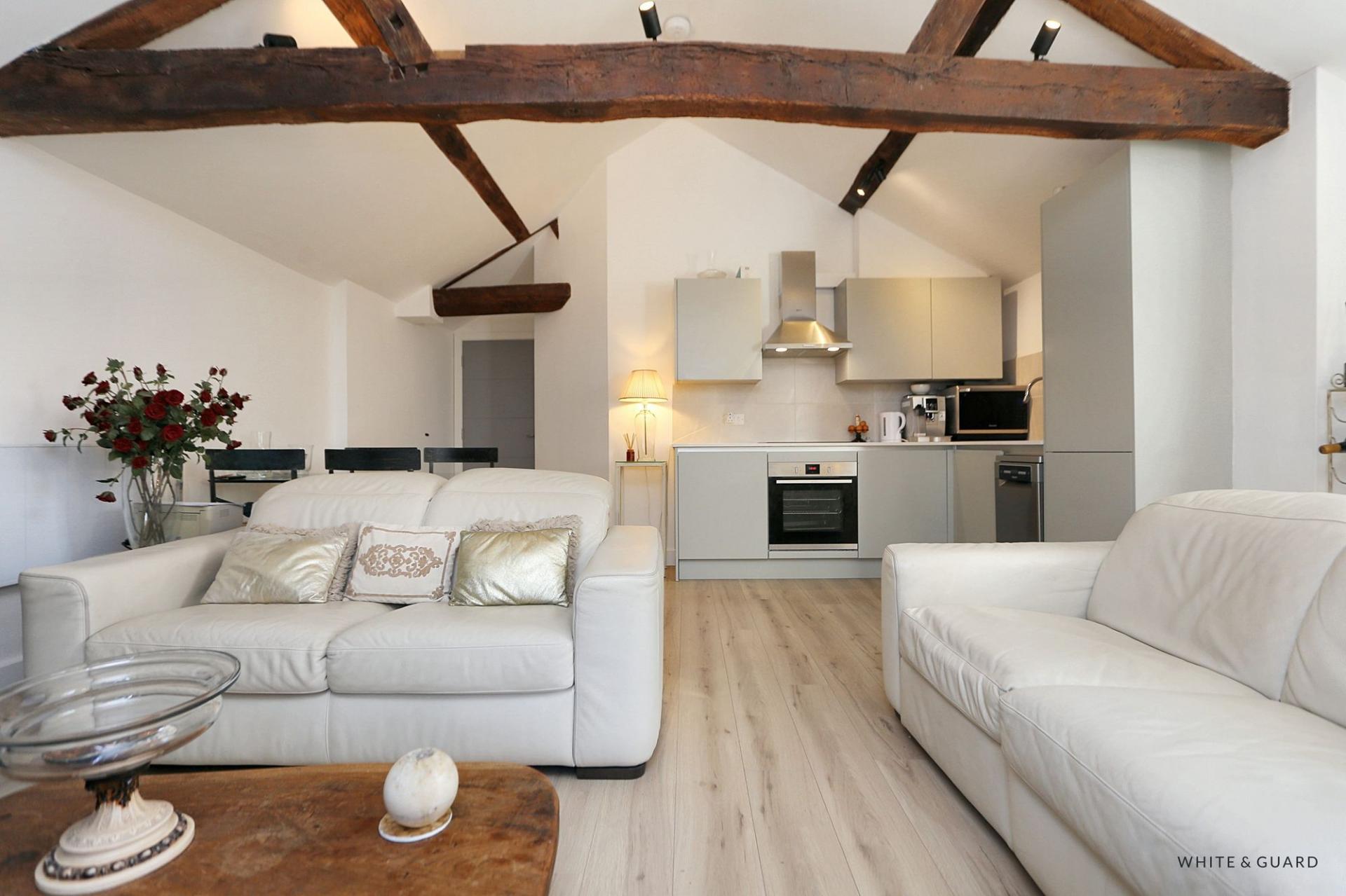 Found on the second floor, the front door opens into an impressive entrance hall which leads to all accommodation. Positioned at the rear of the apartment is the beautifully appointed kitchen dining living room which showcases a vaulted ceiling with original exposed beams that have fitted uplighters, creating a wonderful ambiance. The contemporary fitted kitchen comprises a matching range of wall and base level work units with fitted counter tops over which incorporate an inset electric induction hob and oven and sink and drainer unit. Further integrated appliances include a fridge freezer and washing machine while space and plumbing is provided for a washing machine. The dual aspect room provides ample space for both a dedicated living and dining area. Both bedrooms are well proportioned double rooms each offering space for freestanding wardrobes, bedroom furniture and both rooms deliver character exposed beams within the vaulted ceilings. A well-appointed shower room completes the accommodation and comprises a walk-in shower with fitted glass screen, wash hand basin and WC unit, electric heated towel rail and fully tiled walls and floor.