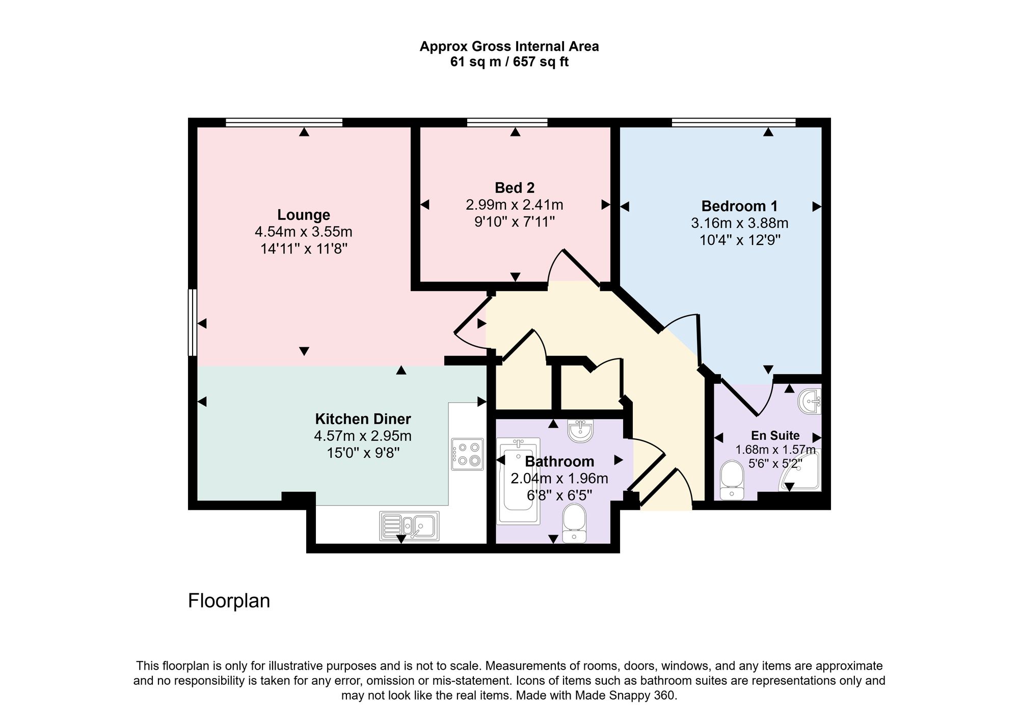 Entry to the property is gained through a security entry system, stairs and a residents lift lead to all floors. Flat 6 can be found on the first floor and the front door opens into the entrance hall which has doors leading to the principal accommodation alongside a practical fitted storage cupboard. The main living space comprises a spacious kitchen dining living room with a bright dual aspect. The room provides a dedicated living area which extends to the kitchen and dining space. The kitchen itself comprises a matching range of wall and base level work units with fitted work surfaces over which incorporate an inset stainless steel sink and drainer, gas hob and electric oven. Furthermore, there is space and plumbing provided for a dishwasher and fridge freezer. The main bedroom is a good size double room which allows space for freestanding bedroom furniture and has an adjoining en-suite which consists of an enclosed mains shower cubicle, wash hand basin and WC. The second bedroom also a double room is currently in use as a spare room and crafts room / study. Completing the accommodation is a well appointed bathroom suite, the offers a panel enclosed bath with shower attachment over, inset wash hand basin with storage cupboard under, WC and a heated towel rail.