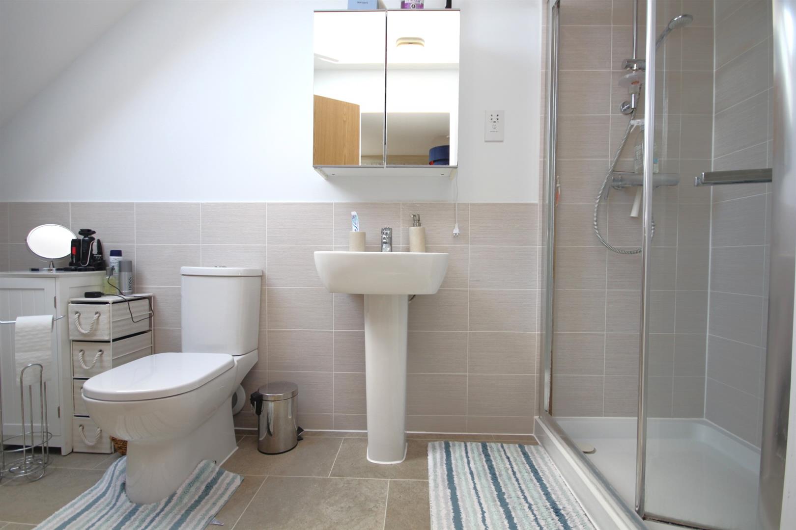Modern en-suite shower room comprising three piece white suite