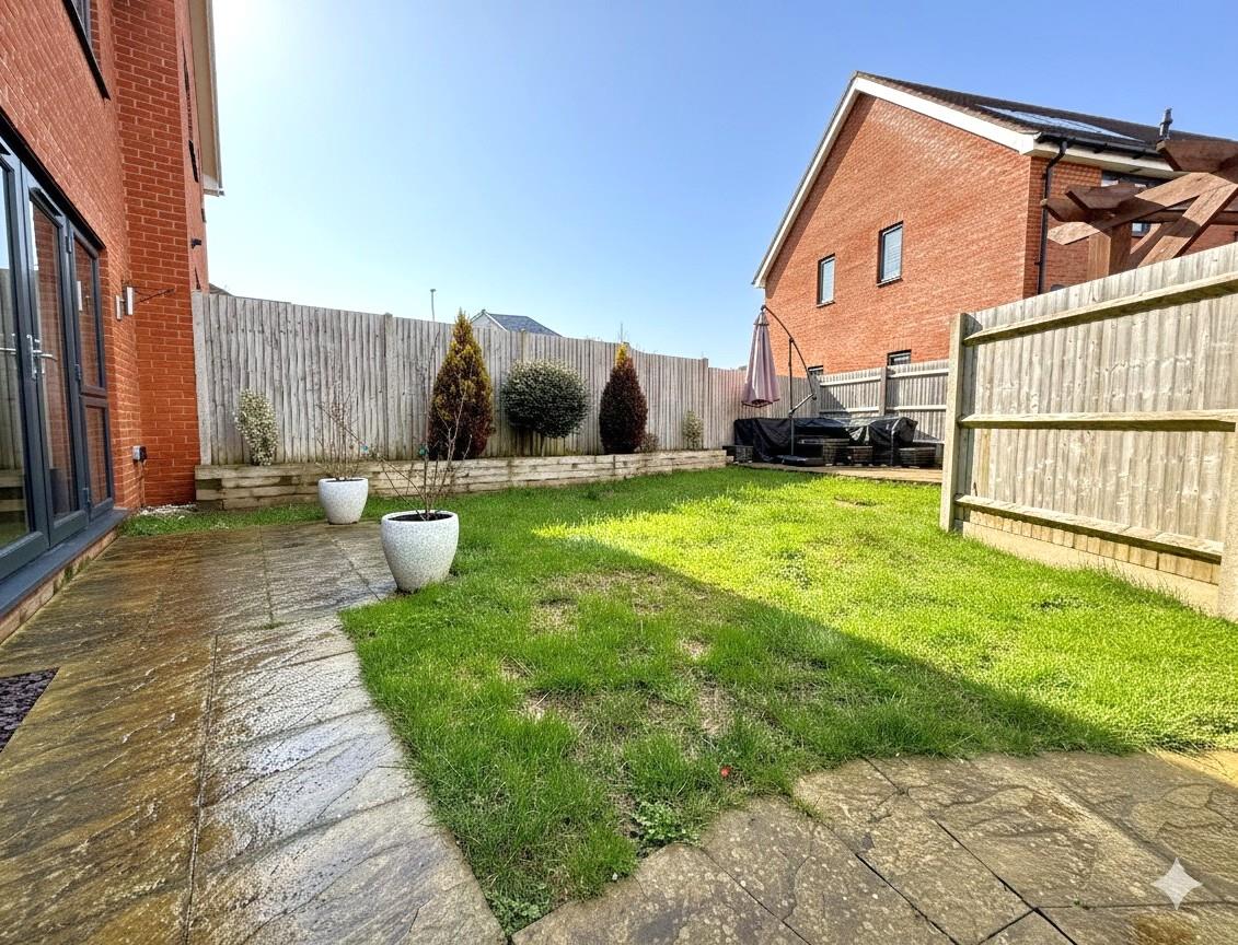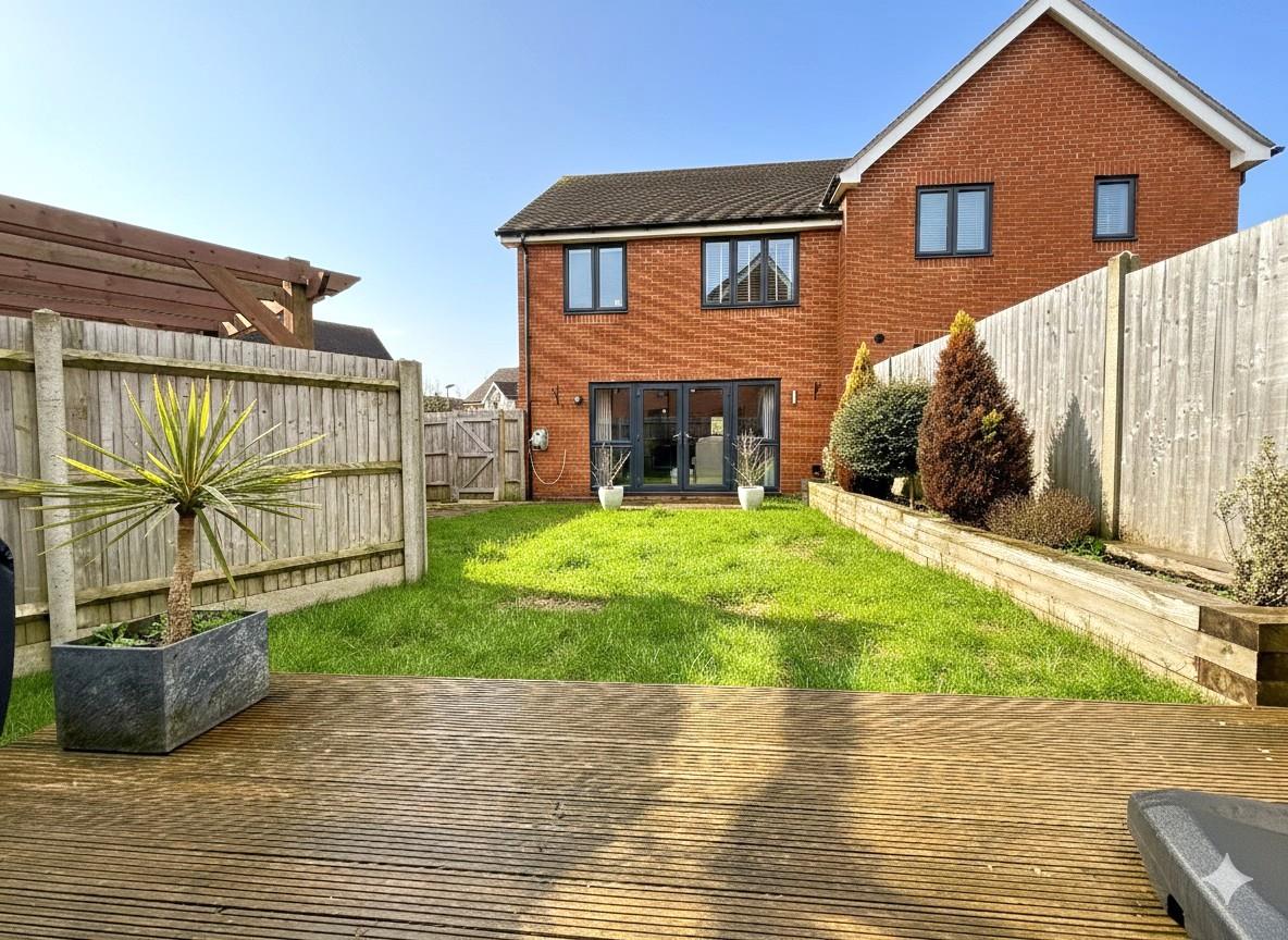 Landscaped rear garden majority laid to lawn with raised sleepers enjoying display flower/shrubbery, paved patio, raised decked sun terrace, shed to remain & side access