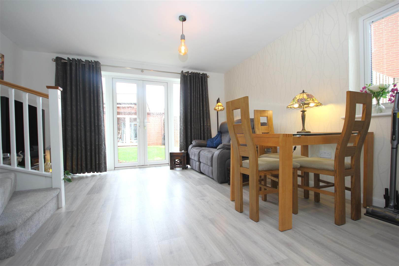 25'6ft open plan triple aspect kitchen/dining/living room with double doors opening out to the rear garden & built in understairs storage cupboard