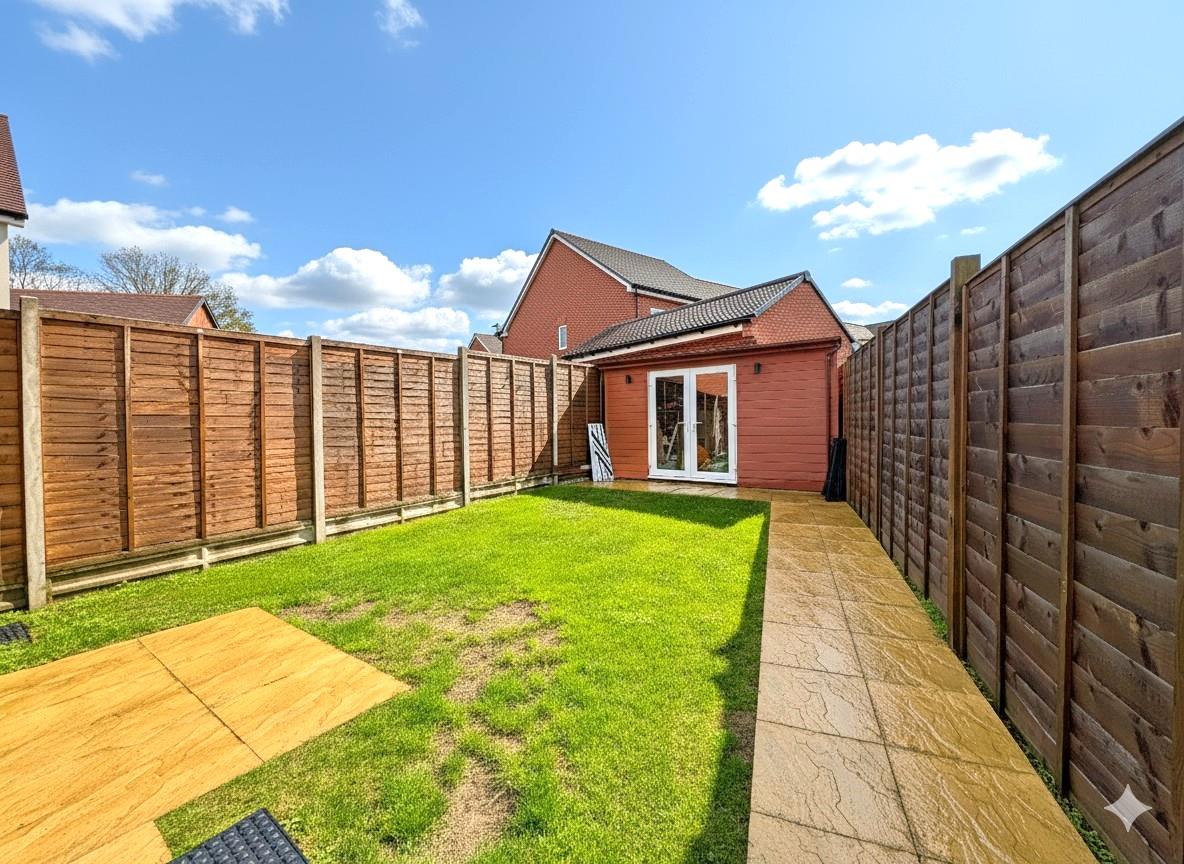 Landscaped rear garden majority laid to lawn with paved patio area & newly added outbuilding to remain